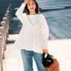 ポンチ素材×ペプラムでラフなのにしっかり上品映え