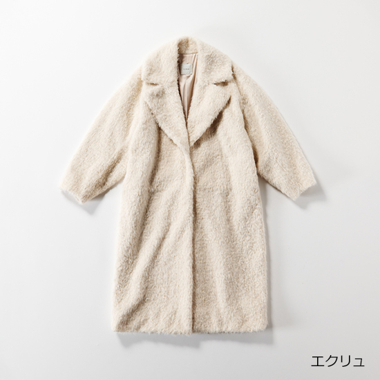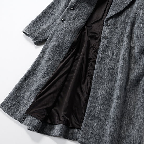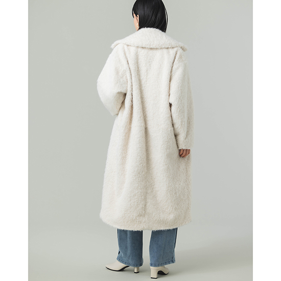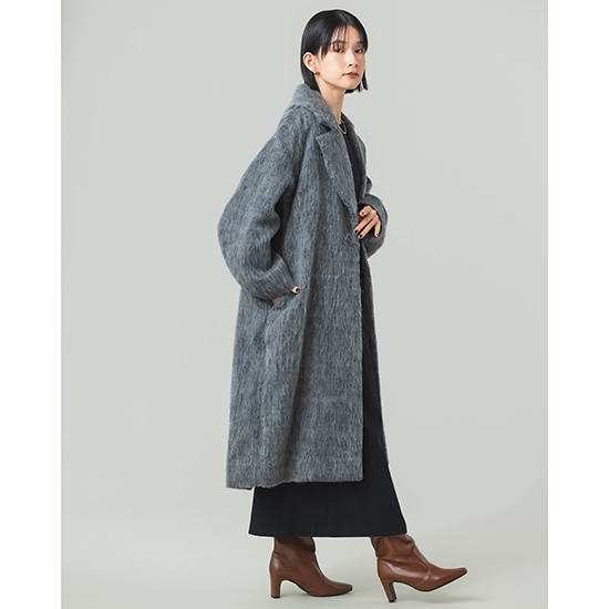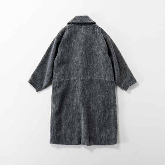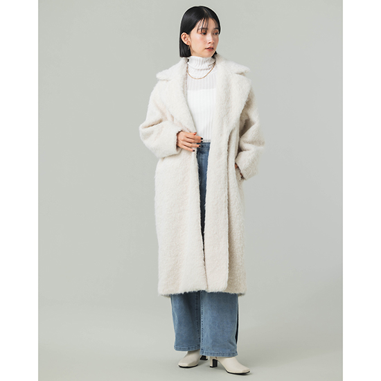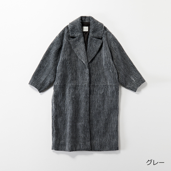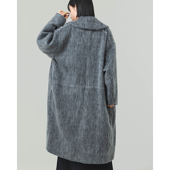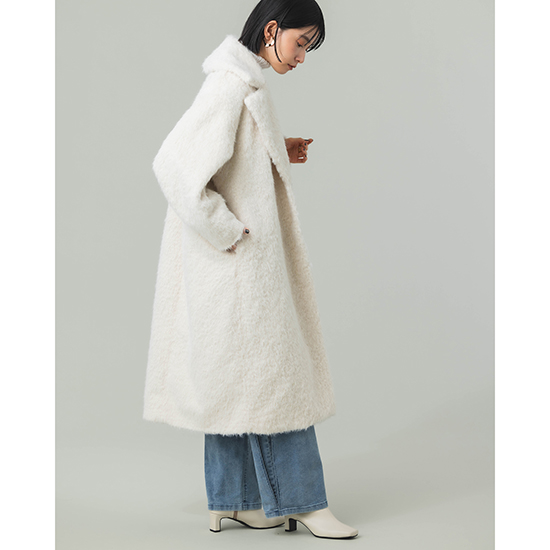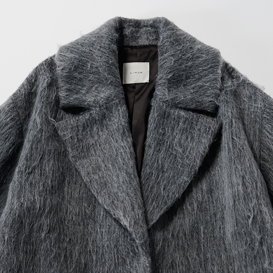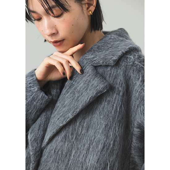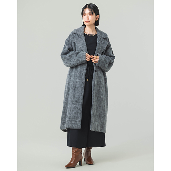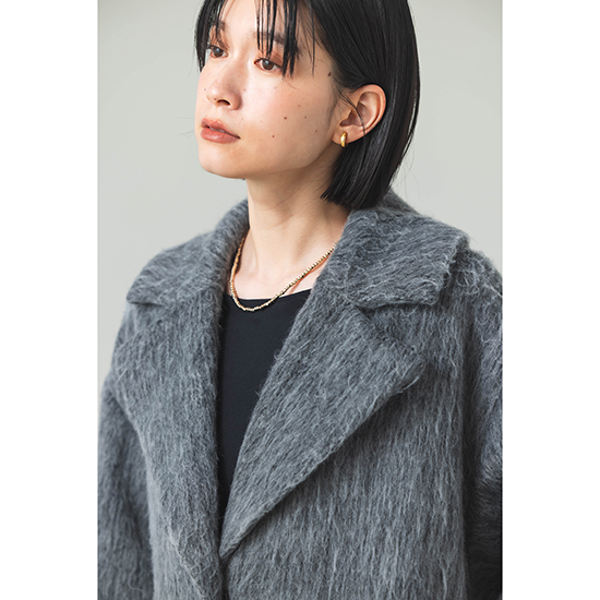 ビッグカラーがアクセントになったオーバーサイズのチェスターコート。