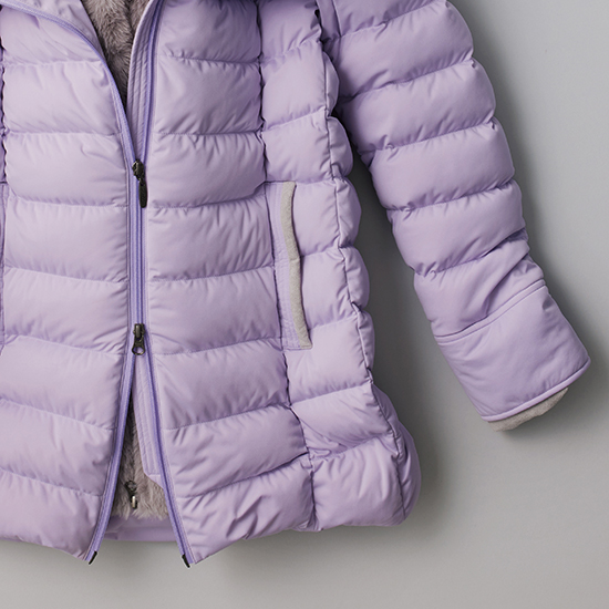 ジップの開閉でファーの見せ方を調整できます。STORY別注カラーのパープルは、派手