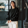 春まで大活躍なスウェットなのに袖フリルでエレガントな表情に。