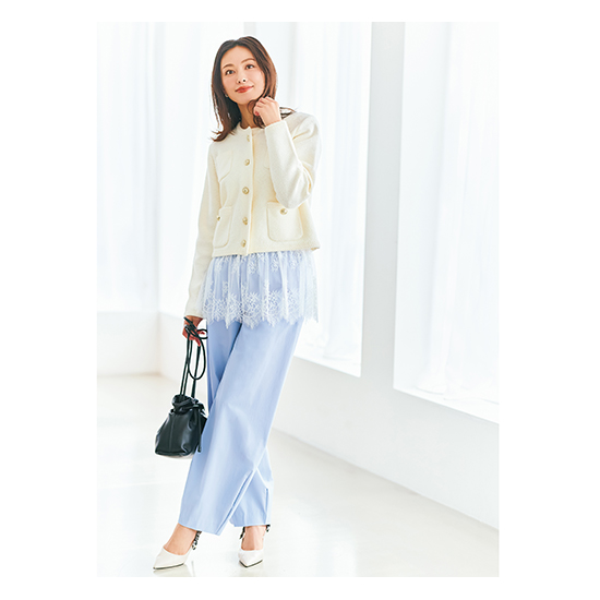 繊細なレースを裾に施したトップスは、今の時期はジャケットを、夏は