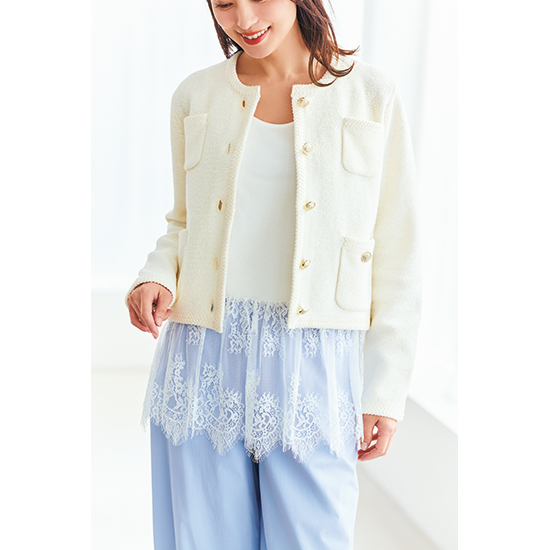 繊細なレースを裾に施したトップスは、今の時期はジャケットを、夏は<br />