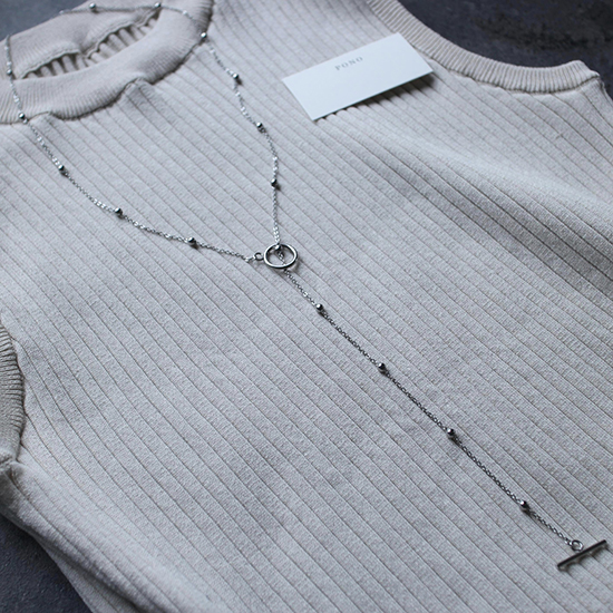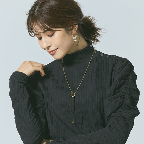 胸もとに存在感を与え、大人の女性らしさを演出するロングネックレス