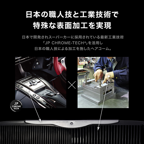 日本の職人技と最新技術が融合した加工技術、JP CHROME-TECH(TM)によって、コーム表面は究極になめらか。さらに高い硬度で製造することで、驚異的な櫛通りと接触ダメージを大幅に軽減することを実現しました。<br />