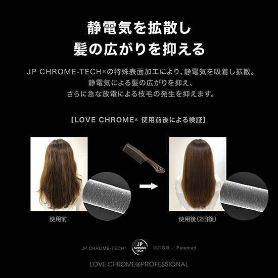 日本の職人技と最新技術が融合した加工技術、JP CHROME-TECH(TM)によって、コーム表面は究極になめらか。さらに高い硬度で製造することで、驚異的な櫛通りと接触ダメージを大幅に軽減することを実現しました。