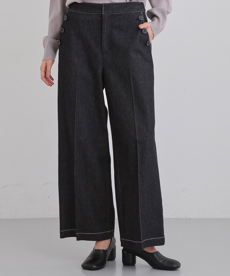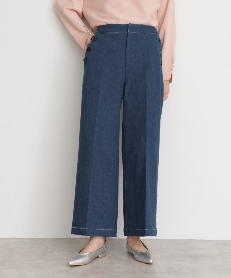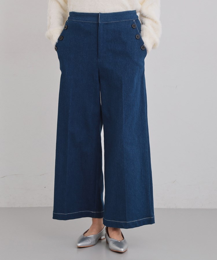 ■ポイントデニム素材のセンタープレスがきれいなワイドパンツ。脇ボタン仕様のマリンパンツ型です。配色のステッチがポイントです。※ポケット数:横×2■素材/機能性ストレッチ感があります。※裏地なし■おすすめコーディネートすっきりとしたニットやTシャツとの相性◎※照明の関係により、実際よりも色味が違って見える場合があります。また、パソコン・スマートフォンなどの環境により、若干製品と画像のカラーが異なる場合もございます。