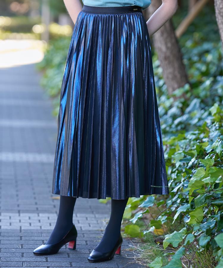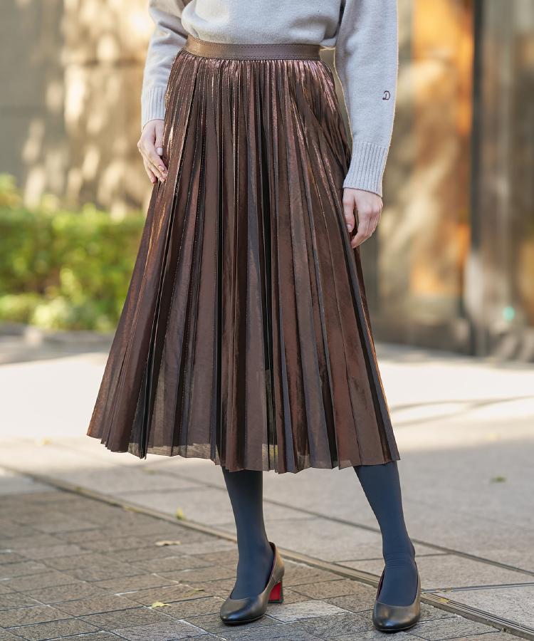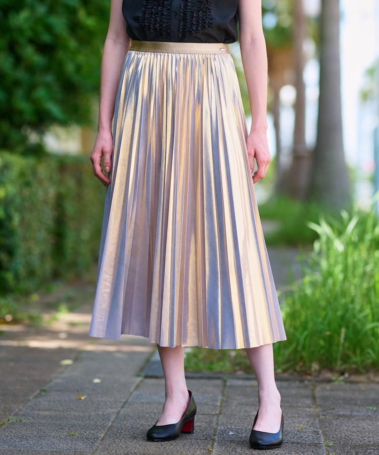 《動く度にきらめく箔の輝きが華やかで、スタイリングに映える!アコーディオンプリーツスカート》●箔の光沢感が華やかな、スタイリングに映える素材●アコーディオンプリーツですっきりした腰回り●ウエストベルトに着心地が良いストレッチサテンゴムを使用●こだわりしなやかな箔の素材にプリーツ加工を施す事で、輝きと陰影が美しく、歩く度に広がる裾がエレガントなスカート。腰まわりで折り目変化のあるアコーディオンプリーツを施し、ウエストまわりはすっきりと、裾も断ち切り仕様にする事で軽やかさのある仕上げりにしています。ウエストベルトはサテンゴムに千鳥ステッチをかける事で、デザイン性とストレッチを兼ね備えた仕様にしています。左脇の金属プレートが、トップスをインした時のポイントに!●素材ハイゲージの軽やかなポリエステルジャージー素材に、箔シートのボンディング加工を施した素材です。ラッセル編みのジャージーならではの落ち感のある素材にプリーツ加工を施す事で、角度によって箔の輝きがかわり、陰影のある見た目を作っています。エレガントな外観でありながら、手洗いとつるし干しでアイロンがいらないイージーケアな点も魅力です。※照明の関係により、実際よりも色味が違って見える場合があります。また、パソコン・スマートフォンなどの環境により、若干製品と画像のカラーが異なる場合もございます。
