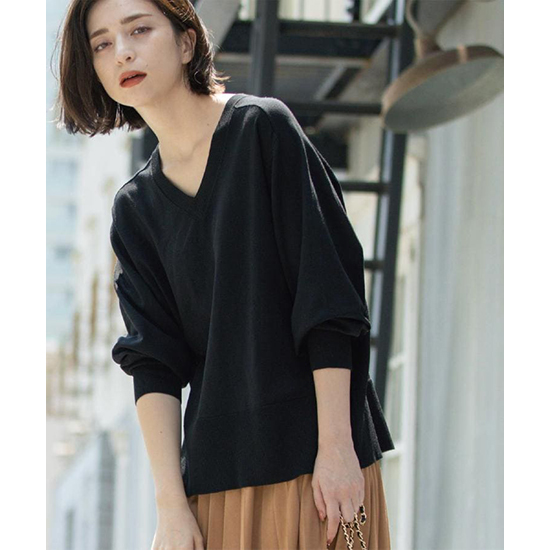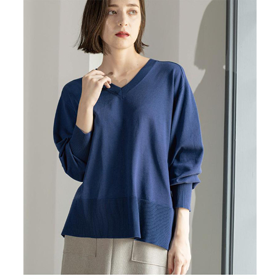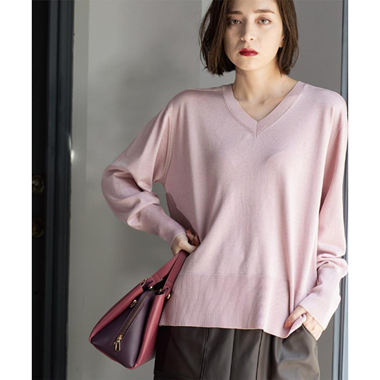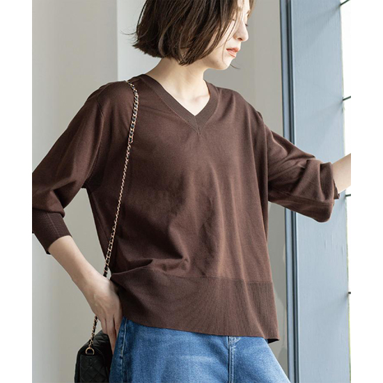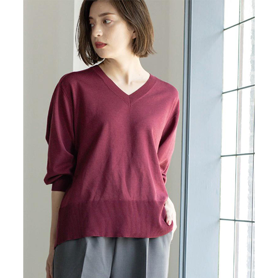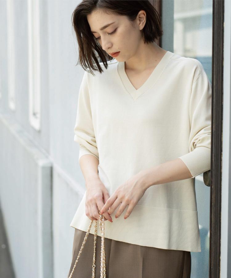 すっきり着られるVネックラインのニット【デザイン】・肩ラインのデザイン切り替えがポイントになっているラグランスリーブニットです。・ゆとりあるシルエットと深めのVネックが抜け感のある着こなしに仕上がります。・後ろネックにつけたオリジナルプレートとリンキングが、後ろ姿も素敵なワンポイントデザインに。・タイトシルエットのスカートやデザインパンツなど、幅広いアイテムとのスタイリングが楽しめるシンプルさも◎【素材】・ヴィスコース(レーヨン)とウール混防の、上品な光沢ときれいな表面感が特徴の14ゲージのハイゲージニットを使用。・マシンウォッシャブルでご自宅でのお洗濯も可能。※照明の関係により、実際よりも色味が違って見える場合があります。また、パソコン・スマートフォンなどの環境により、若干製品と画像のカラーが異なる場合もございます。