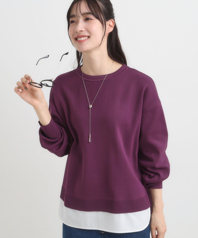 【デザイン】身体のラインを拾いにくく、ヒップをすっぽり隠してくれる、体型カバーにもおすすめの一枚です。裾シャツレイヤード風のデザインで、シンプルながらも一枚着るだけでこなれ見えが叶います。ややドロップショルダーで動きやすく、リラックス感のあるシルエットがおすすめのポイント。また、見た目以上に軽いのも魅力の一つ。今回のモデルは、襟周りにさりげない編み柄を入れて秋冬らしくアレンジしています。【スタイリング】肌離れが良いので、体型カバーコーデにもおすすめです。秋口にはスキニーやテーパードパンツなどと合わせて、さらりと一枚で着ていただけます。寒い時期は、中にあったか機能つきの長袖インナーを着ていたくと長い期間活躍します。レイヤード風のデザインなのでインせずにさっとコーデが決まり、忙しい日のスタイリング選びにもおすすめです。ワイドシルエットのデニムと合わせると、ゆるっとしたこなれ見えコーデが完成します。身幅や裾は程よくゆとりがあるデザインなので、細身のナロースカートにもぴったりです。プリーツスカートなど落ち感あるふんわりシルエットのボトムに合わせれば、リラックス感のある大人カジュアルスタイルになります。【素材】本体のニット部分は軽さが特徴。膨らみのある風合いやモチっとした弾力性が、まるでスポンジのような生地感が特徴の糸で編み立てています。※照明の関係により、実際よりも色味が違って見える場合があります。また、パソコン・スマートフォンなどの環境により、若干製品と画像のカラーが異なる場合もございます。