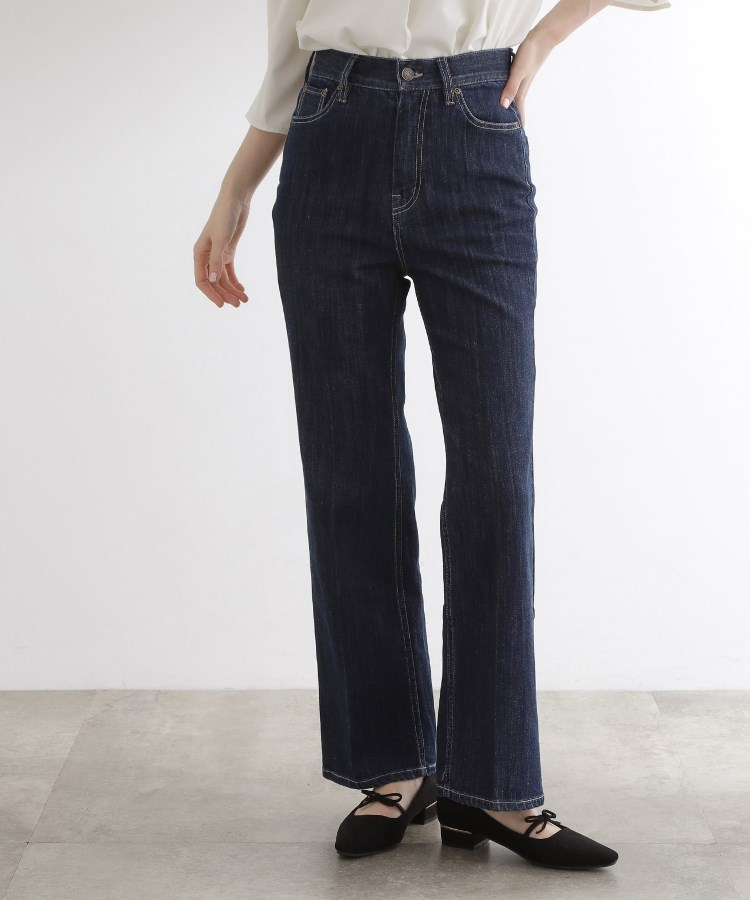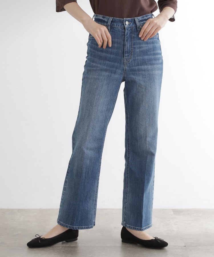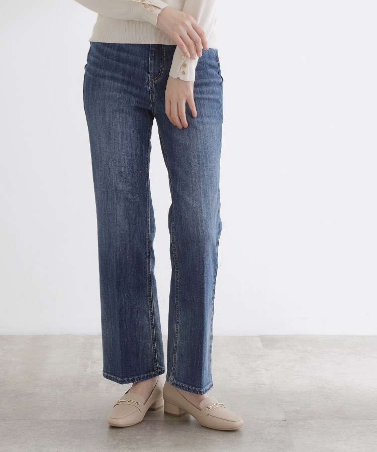 美しさも、動きやすさも。欲張りに叶えるソフトフレアーデニム【デザイン】春夏も人気のソフトフレアーデニムがバージョンアップして登場!やわらかく広がるソフトフレアで自然と脚をすっきり美しく、ほどよく広がるシルエットが脚のラインをきれいに見せながらもナチュラルな印象に。トレンド感のあるソフトフレアデザインは、日常のスタイルに華やかさを添えてくれます。脚長効果もありながら抜け感があり、気負わず穿けるバランスが魅力です。こだわりの加工感でより本格的な高見えする1本です。【素材】肌なじみのいい綿素材に、形状回復率の高いポリエステルをミックス。伸びて戻るので膝が出にくくきれいな状態をKEEPできるのが嬉しいポイント。さらに微ストレッチが加わることで、しっかりフィットしながらも窮屈感のない穿き心地に。長時間穿いても型崩れしにくく、美しいシルエットをしっかりキープしてくれます。こだわりの加工感と縦スラブの表情ある表面感が高見えし、お値段以上の価値のある1本です。【スタイリング】カジュアルにもきれいめにも。一枚で着こなしが決まる主役級デニム。Tシャツやスニーカーでラフに、ブラウスやヒールで少しきちんと感を。トップスをインしてもアウトにしてもバランスが取りやすく、スタイルアップを自然に叶えてくれます。季節を問わず、ワードローブの「頼れる一本」として活躍します。※好みのスタイルバランスや身長に合わせて対応できるようレギュラー丈に+5cmのトールサイズ(21:トールSサイズ/22:トールMサイズ/23:トールLサイズ)も新しくご用意!【仕様】・ポケット数:横×3 後ろ×2・前ファスナー・裏地なし※照明の関係により、実際よりも色味が違って見える場合があります。また、パソコン・スマートフォンなどの環境により、若干製品と画像のカラーが異なる場合もございます。【25AW】