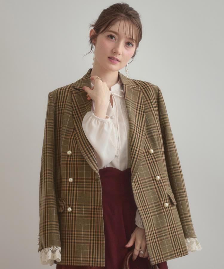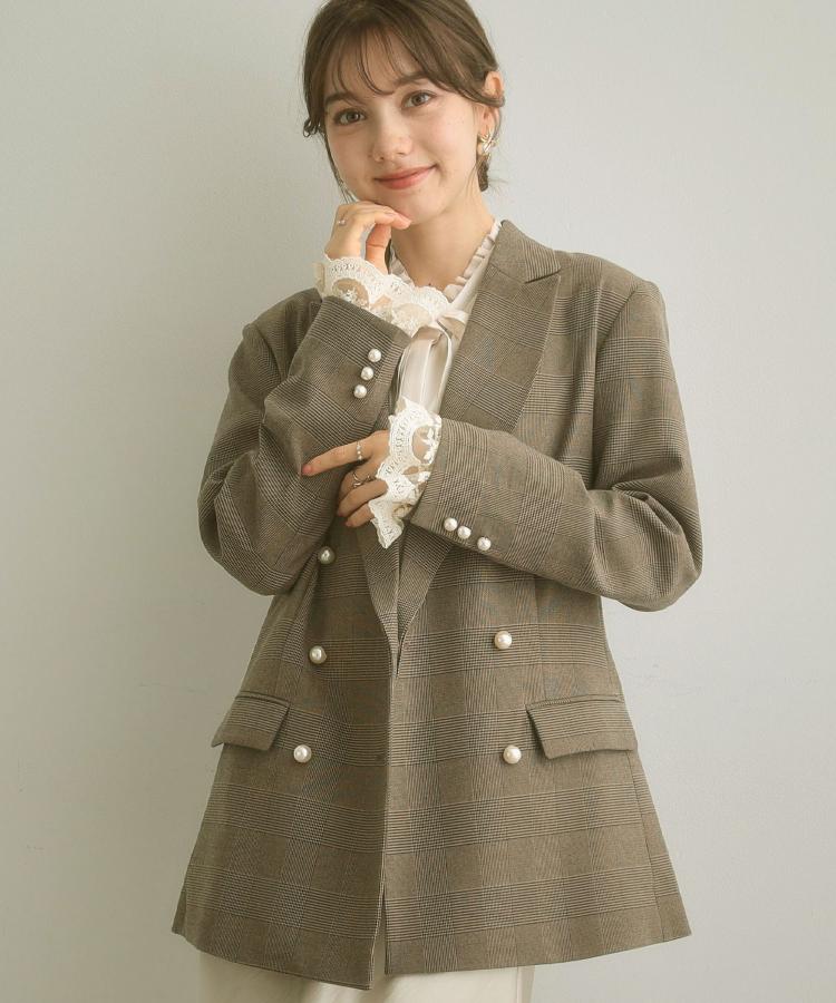 袖口に取り外し可能なレースカフスを付けたパール調釦テーラードジャケット~POINT~フェミニンさときちんと感のあるCouture Broochらしいアイテムです◎高級感のあるパール調ボタンがおしゃれポイントに!※240番の大柄チェックは、一部店舗とオンライン限定展開です【素材・機能】表地は3素材アソート094番は、細綾のキレイめな無地生地を使用240・254番は、平織りの先染めチェック生地を使用しっかりとした肉感のある表生地で、インナーアレンジで初冬までご着用いただけます【仕様】・ポケット数:横×2・裏地:背抜き仕立て・後ろベンツ開き※照明の関係により、実際よりも色味が違って見える場合があります。また、パソコン・スマートフォンなどの環境により、若干製品と画像のカラーが異なる場合もございます。【スタッフコメント】・saori(153㎝)トレンド感のある秋らしいチェック柄と、お仕事にも着られる定番ネイビーの可愛いデザインジャケットです◎腰回りがカバーできる安心丈でボトムとの着丈バランスも◎袖口のレースも簡単に取り外しが可能なので、幅広いシーンで着用いただけます!【25AW NEW ARRIVAL】【25AW NEW COLLECTION】