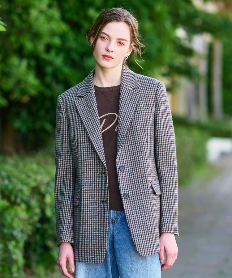【尾州で織られた国産ならではのラグジュアリーなウール混素材のジャケット!トレンド感のあるガンクラブチェックが目を惹く!】●ジャケットの顔となる衿のパターンにこだわり●トレンドとドレステリアの今期テーマにマッチしたマニッシュな1着●丁寧に織り上げられた国産ウールを使用●こだわりクラシカルでメンズライクなムードにこだわったテーラードジャケット。トレンドの大きめラペルを意識しながら、着易いバランスに落とし込みました。肩回りなども少しメンズライクなニュアンスを残しながら、女性らしい雰囲気に仕上がるようにサイズ感にこだわっています。袖裏にはシックな印象のストライプ柄を使用。袖を織り上げて柄×柄を見せるのもこなれ感がありお洒落です。ボトムはワイドなどのパンツ合わせがおすすめですが、ボリューム感のあるスカートと合わせるのもマッチします。●素材世界有数のテキスタイル産地である「尾州」のウール素材。トップ糸を使用したウールで「ミルド」と呼ばれる加工を施しています。「ミルド」は、縮絨(縮みやすくする加工)、剪毛(毛を切りそろえる加工)、圧絨(毛羽を押しつぶす加工)などを施し、織り目が見える程度の毛羽立ちを表面に作ることで独特の風合いや質感を生み出します。袖の裏地もキュプラのストライプ柄を使用しているので、とても滑りが良く着心地が良い。※照明の関係により、実際よりも色味が違って見える場合があります。また、パソコン・スマートフォンなどの環境により、若干製品と画像のカラーが異なる場合もございます。
