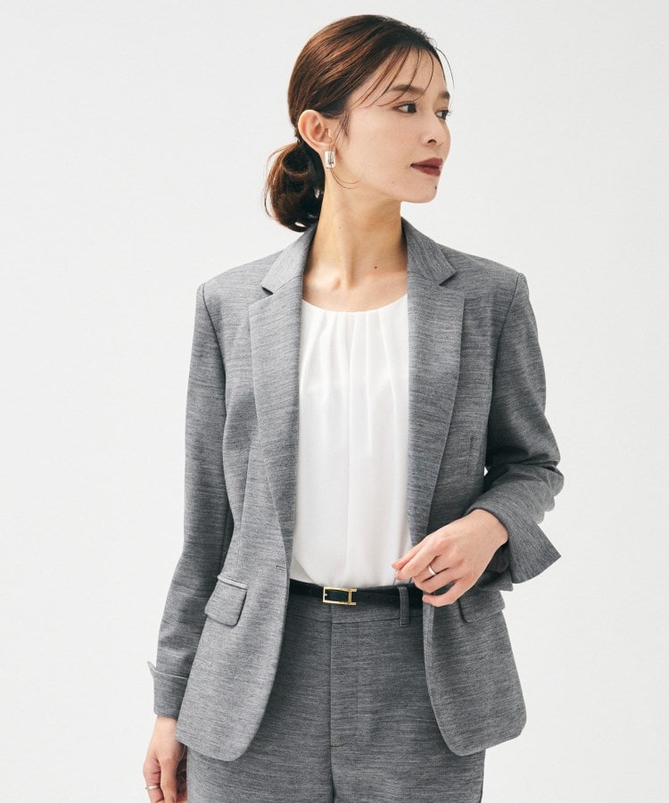 【デザイン】秋冬定番のジャージ素材のテーラードジャケットは、クラシックなデザインをベースにしながら、現代的な機能性と快適さを兼ね備えた一着です。シルエットはスタイリッシュでありながら、動きやすさを考慮した設計となっています。【素材感】秋冬定番のジャージでのスーツ素材を今シーズンはリニューアルしています。ウォッシャブル対応の防縮ウール糸と特殊ナイロンを交編し、極限まで度目を詰めて編む事で、よりシャープで綺麗な目面に仕上げています。また、後加工で更に特殊な織物風防縮加工を施す贅沢な工程をへる事により、縮率の安定、洗濯後の表面変化も崩れにくく、布帛ライクなのが特徴。天然素材でありながらテクニカルな生地で、ジャージであるリラックス感を持ちながらも、布帛のような仕立て映えとエレガントさをも併せ持った拘りの素材になります。【着こなしポイント】同素材のノーカラージャケット(商品番号:153-44503)、テーパードパンツ(商品番号:153-64502)、マーメイドスカート(商品番号:153-74502)の展開です。【仕様】・ポケット数:横×2 内側×1・裏地:総裏仕立て※照明の関係により、実際よりも色味が違って見える場合があります。また、パソコン・スマートフォンなどの環境により、若干製品と画像のカラーが異なる場合もございます。