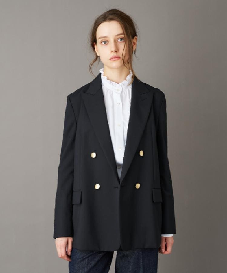 【好評のウールブレンドのダブルブレストテーラードジャケット】●スッキリとしていてマニッシュな印象のテーラードジャケット●ストレッチ性があり着やすい●リサイクル原料を使用したサスティナブルな素材●細番手のウールを使用したラグジュアリーな素材●こだわり程良くゆとりのあるシルエットに、ピークドラペルで少し辛口な印象にしたブレザー。袖口を折り返すことで現れるストライプ柄が、スタイルのアクセントになります。メタル釦を使用し、トラッドな印象ですが女性らしい雰囲気があります。ポケットや衿の切り替えの位置、角度など、着た時にスタイル、バランスが良く見えるようにこだわりました。●素材2/72の細番手の梳毛ウールを使用したらラグジュアリーな素材。ポリエステル混でシワに強いので、長くご愛用いただけます。また、ストレッチ性もあるので、キチンと感がありながら着やすさも兼ね備えたジャケット。上品な微光沢があります。※照明の関係により、実際よりも色味が違って見える場合があります。また、パソコン・スマートフォンなどの環境により、若干製品と画像のカラーが異なる場合もございます。