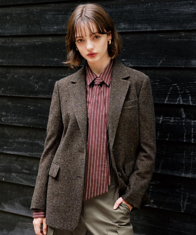 【尾州で織られた国産ならではのラグジュアリーなウールを使用した、クラシカルでマニッシュなジャケット!】●ジャケットの顔となる衿のパターンにこだわり●トレンドとドレステリアの今期テーマにマッチしたマニッシュな1着●丁寧に織り上げられた国産ウール素材を使用●こだわりクラシカルでメンズライクなムードにこだわったテーラード。トレンドの大きめラペルやカッチリとした肩回りを意識しながら、着やすいバランスに落とし込みました。メンズっぽさを意識しながらも、女性らしい印象に仕上げたこだわりの詰まったジャケットです。袖裏にはシックな印象のストライプ柄を使用。袖を織り上げて柄×柄を見せるのもこなれ感がありお洒落です。ボトムはワイドなどのパンツ合わせがおすすめですが、ボリューム感のあるスカートと合わせるのもマッチします。●素材世界有数のテキスタイル産地である「尾州」のウール素材。縦にループ糸を使用。横は2種類の希少なランダムにちりあめられたカラーネップ糸を組み合わせる事で、深みのある色調と豊かな立体感を出しています。とても仕立て映えのするしっかりとしたウール素材ですが、見た目に反してとてもソフトで膨らみがあるので、軽くて着やすいジャケットに仕上がっています。袖の裏地もキュプラのストライプ柄を使用しているので、とても滑りが良く着心地が良い。※照明の関係により、実際よりも色味が違って見える場合があります。また、パソコン・スマートフォンなどの環境により、若干製品と画像のカラーが異なる場合もございます。
