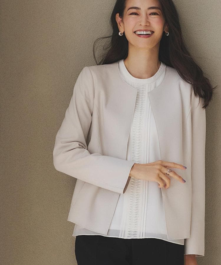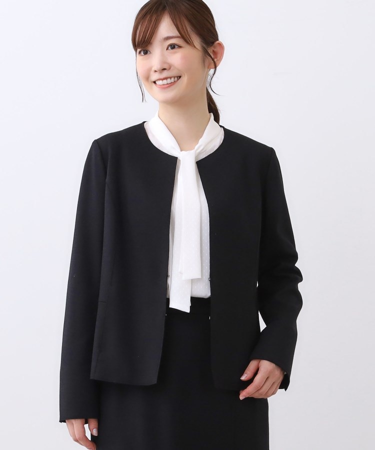 【デザイン】キレイめのジャージ素材で仕上げた通勤にぴったりのジャケット。すっきりとしたシルエットですが、断ち切りの始末などで軽さを出しているので気軽に羽織っていただけます。単品使いでも使いやすく、同素材のスカートとセットでお召しいただくとよりきちんと感のある着こなしになります。※同素材のスカート(101‐74005)とセットアップが可能です。【素材】 1/60ウールスムースをミルド加工し、程よい厚みとハリ感を出したジャージ素材です。光沢加工を施すことにより通常のウールスムースよりもツヤ感があり、ウールの毛羽立ちを抑えたクリアな表面感が特徴です。【仕様】・ポケット数:横×2・裏地:総裏仕立て※照明の関係により、実際よりも色味が違って見える場合があります。また、パソコン・スマートフォンなどの環境により、若干製品と画像のカラーが異なる場合もございます。