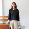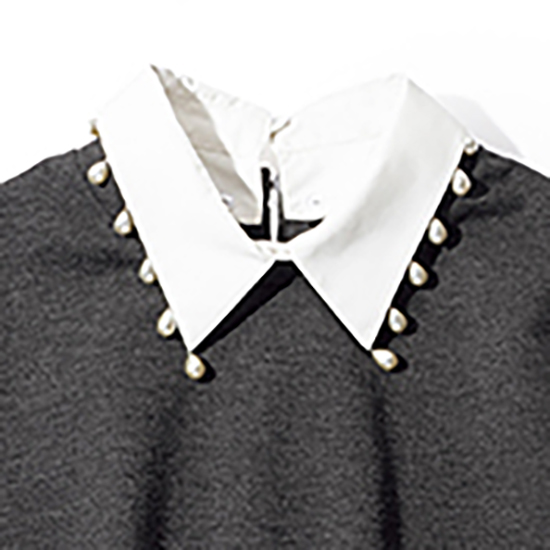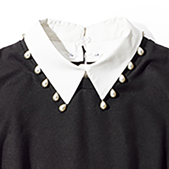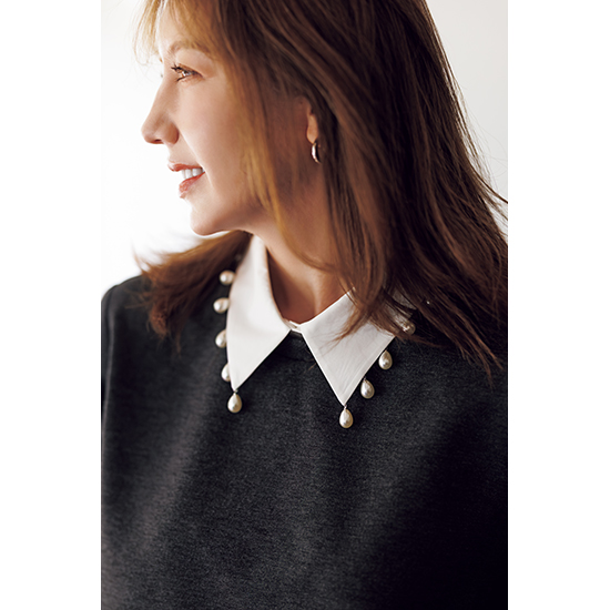 パールが衿元で動くたびにスウィングするのが可愛い白衿トップス。