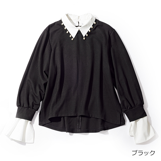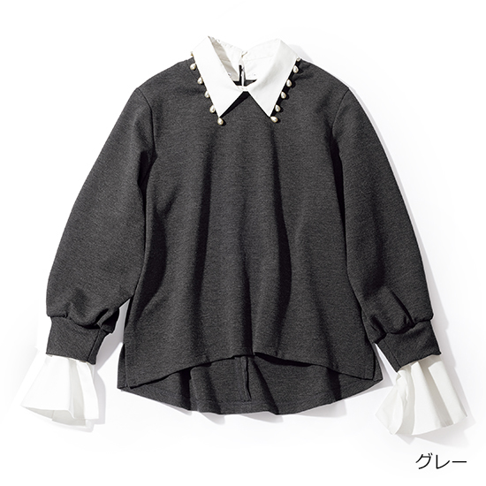 パールが衿元で動くたびにスウィングするのが可愛い白衿トップス。<br />
