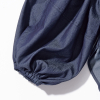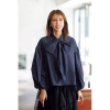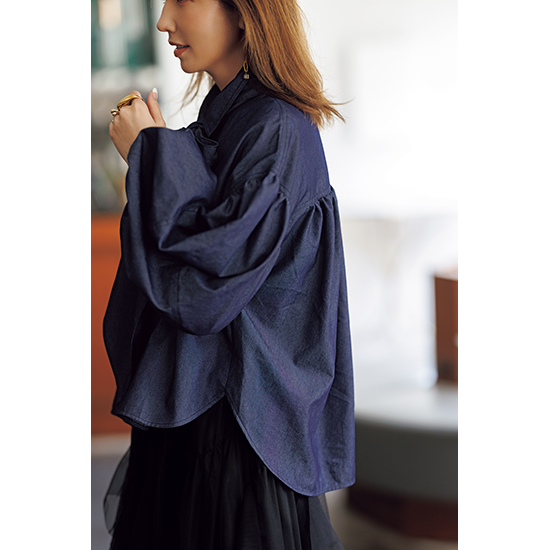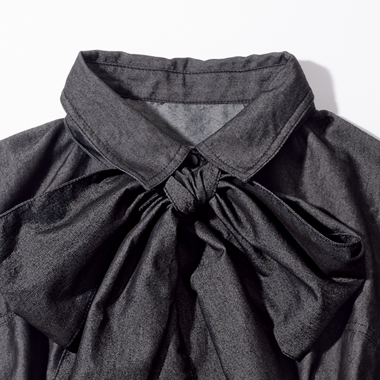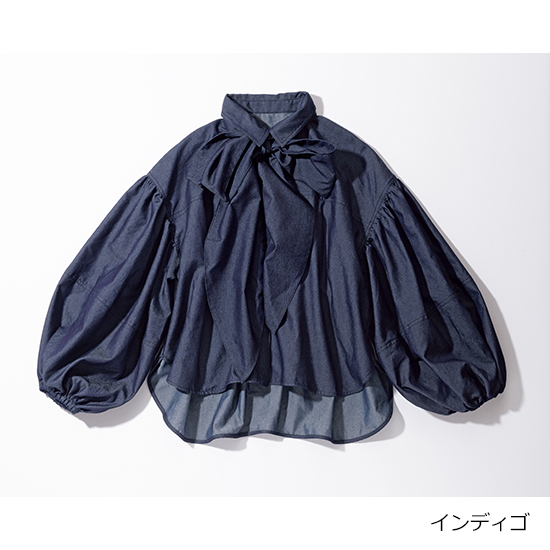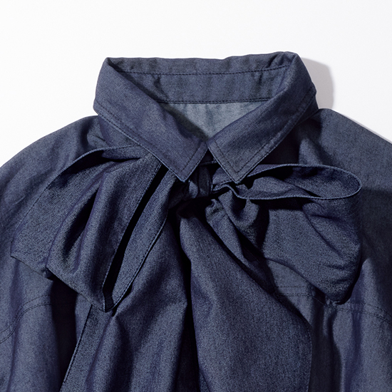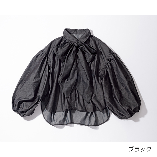 ボリュームのある袖、大きめなリボンタイがカジュアルなデニム素材を大人の<br />