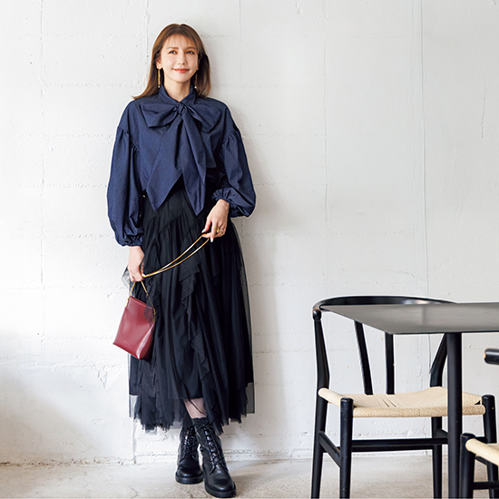 リボンなしでシンプルに少し辛口にシフトできるので幅広いテイストを楽しめます。