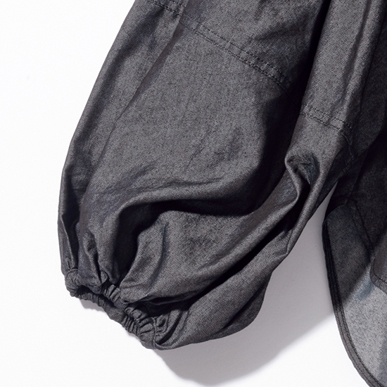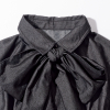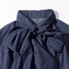 ボリュームのある袖、大きめなリボンタイがカジュアルなデニム素材を大人の
