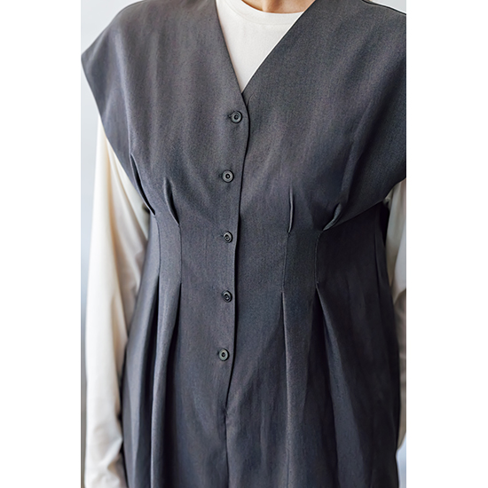 さらにウエストに配したタックが間伸びした感じを防いで、立体的なシルエットに<br />
