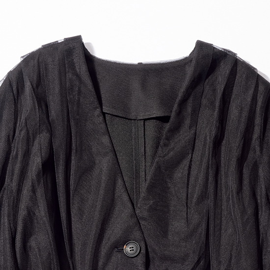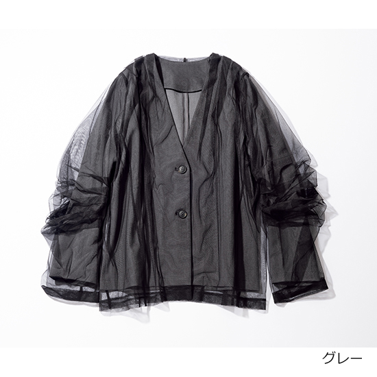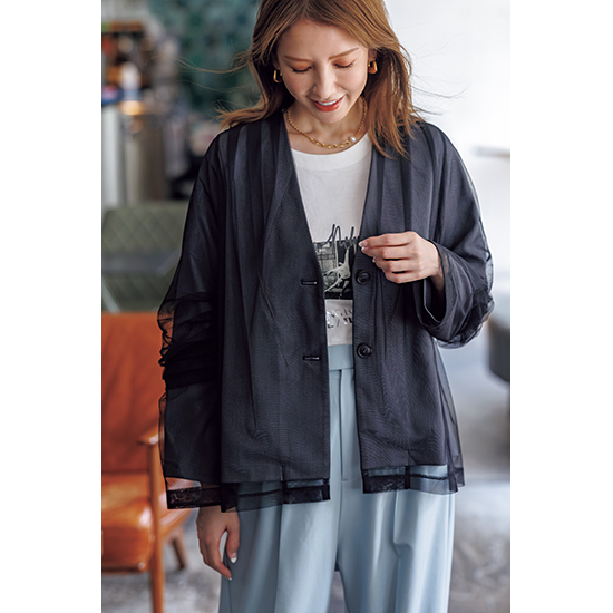 スーツ素材にチュールをレイヤードしたジャケットはオシャレ感度の高いアイテム。<br />