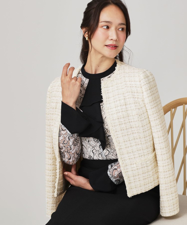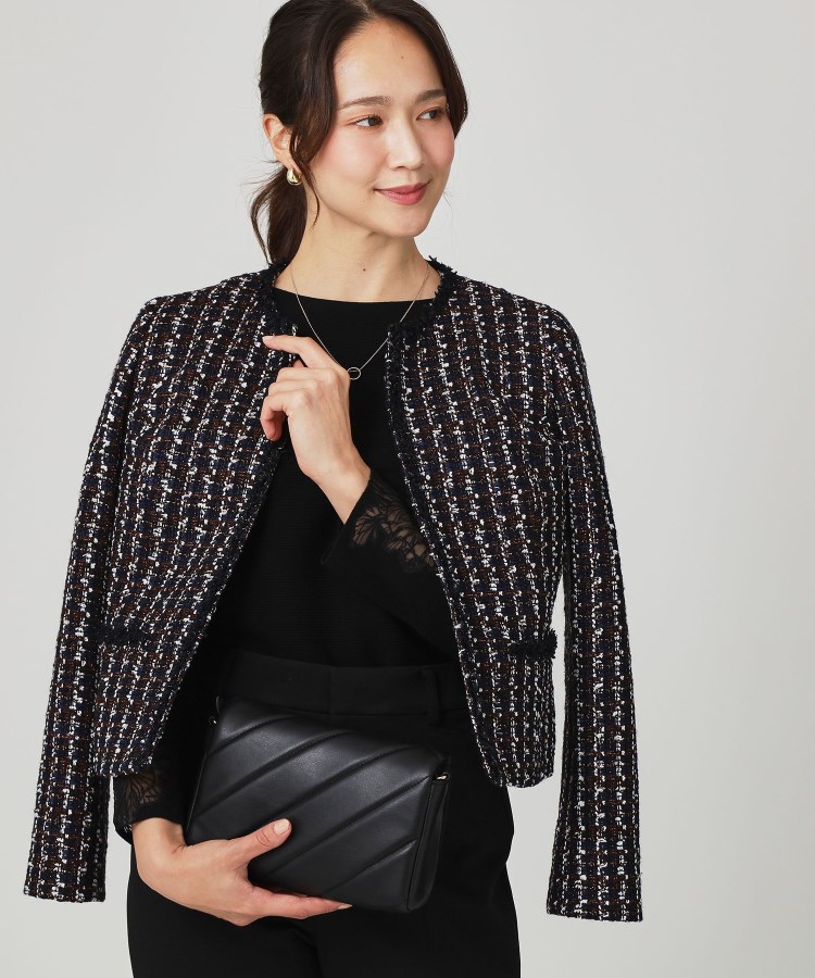 〇デザインポイント華やかで上品なジャケットです。ワンピース合わせのバランスを考えたショート丈で仕上げています。程よく体のラインに沿わせてくびれを作り、クードシャンスならではのフェミニン感あるジャケットです。衿ぐりから前端とポケット口にキラリとするブレードを付け華やかさをアップさせております。配色のサテン裏地を使用し特別感をプラスしているのもポイント。袖先にはスリットを施しターンバッグができます。〇素材ポイントほんのりラメ入りで上品なファンシーツイードです。〇スタイリングポイント羽織るだけで華やかさがUPします。同素材のワンピース(品番187-54900)を展開していますのでセットアップとしてもおすすめです。【仕様】・ポケット数:前×2・裏地:総裏仕立て※照明の関係により、実際よりも色味が違って見える場合があります。また、パソコン・スマートフォンなどの環境により、若干製品と画像のカラーが異なる場合もございます。