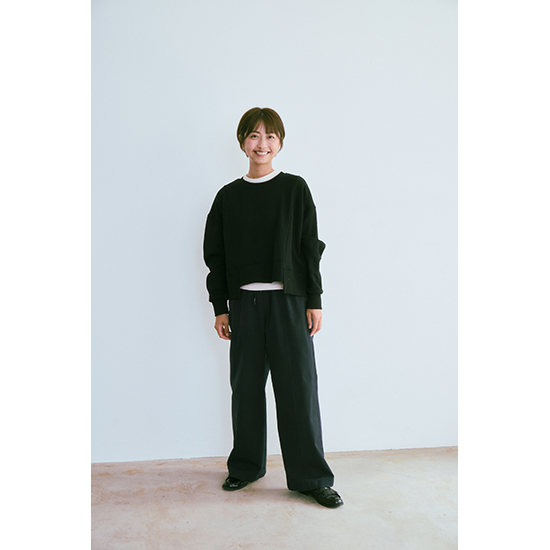 着やすい合わせやすいカットソーのフロント部分に、ステップを付けることで、気になるお腹をデザインで目くらまし!