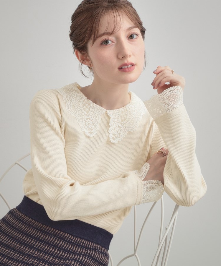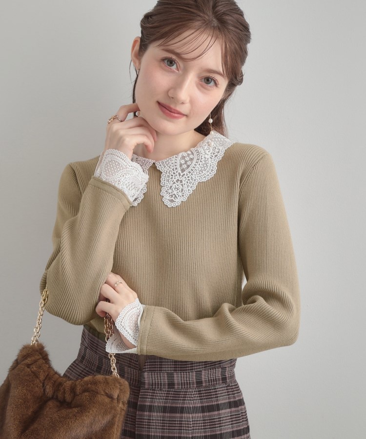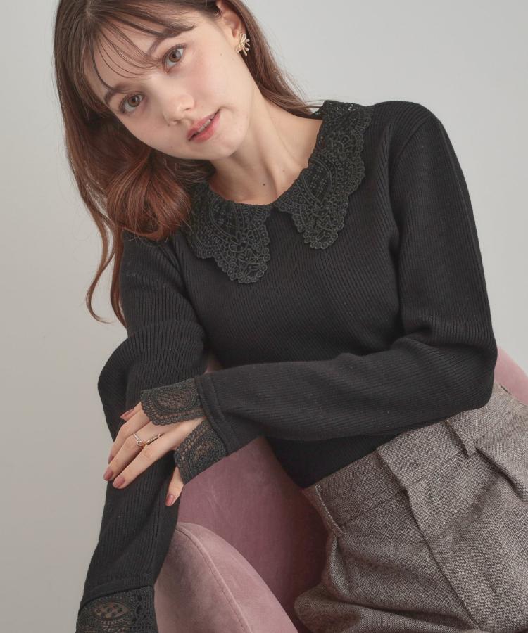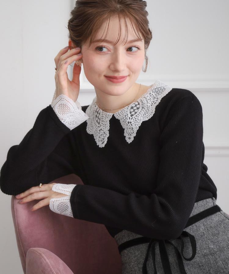 【着映え・フェミニン・通勤】レース衿カフス付きリブニット