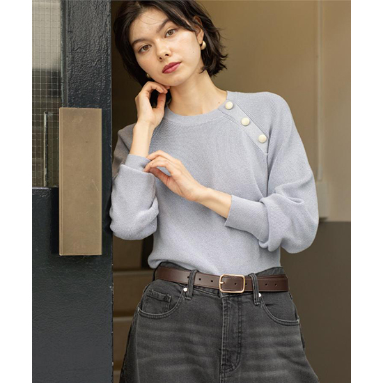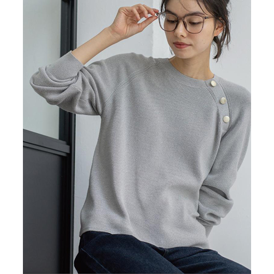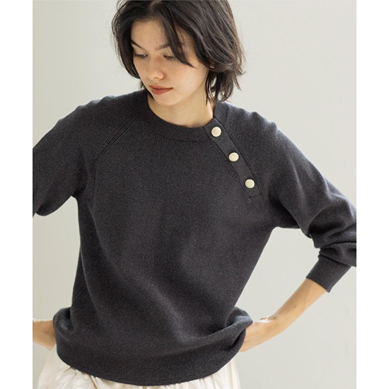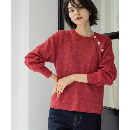 衿元の飾りボタンデザインでさりげなく華やぐ!デイリーに活躍する、上品な煌めきのラメ入りニット【デザイン】・自然に身体から離れる小畦編みを採用した、ややゆとりのあるシルエット。・衿元にシャンパンゴールドのボタンを付けて、アクセサリー要らずのワンポイントに。・袖口はリブ仕様になっており、袖捲りもしやすく快適に着られます。・裾は締め付けのない仕様なので、パンツにもスカートにも合わせやすいデザインです。【素材】・毛混の混紡素材を使用しており、あたたかみがありつつもきれいめに着用できる素材感。・さりげなく煌めく、上品なラメ入りの糸を使用。・マシンウォッシャブルでお手入れも簡単です。※照明の関係により、実際よりも色味が違って見える場合があります。また、パソコン・スマートフォンなどの環境により、若干製品と画像のカラーが異なる場合もございます。