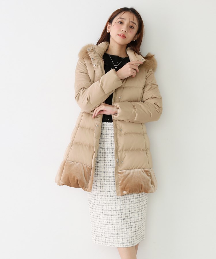 〇デザインポイントシルエットに拘ったインパクト大のクードらしいダウンコート。微光沢のタフタ素材と裾周りに別布のベロア素材を合わせた新しいダウンです。ウエストマークをポイントに、ゴム入りのギャザーベルトを付け細見え効果を狙いました。顔周りが華やかになるフォックスファーを使用しています。80cmのミディ丈でバランスが取りやすく、パンツでもスカートでも合わせやすいデザインです。フード部分は取り外し可能で2WAY仕様、袖口は寒くないように内側をゴム仕様にしています。〇素材ポイントフランス産ホワイトダックダウンでFP800の良質ダウンを使用。保温性も有したダウンです。表地はクードシャンスらしい微光沢のタフタ素材です。ファー部分は毛皮フォックス。(詰物)ダウン90%フェザー10%。〇スタイリングコメントキレイめなスタイリングはもちろん、デニム等カジュアルなスタイリングにも合わせていただきたい一押しのダウンコートです。【仕様】・ポケット数:横×2・裏地あり※照明の関係により、実際よりも色味が違って見える場合があります。また、パソコン・スマートフォンなどの環境により、若干製品と画像のカラーが異なる場合もございます。