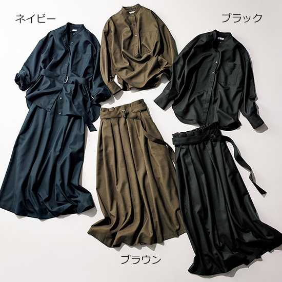 長めの共布ベルトは、バックルをサイドにしてモード感をONしたり、リボン結びにするなど、様々に遊べて便利。腰回りはスッキリと見えるハイウエストデザインで後ろは<br />