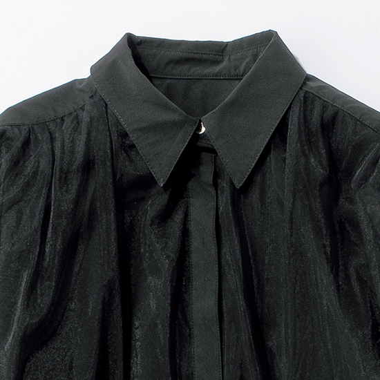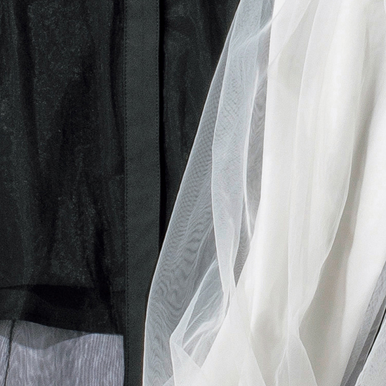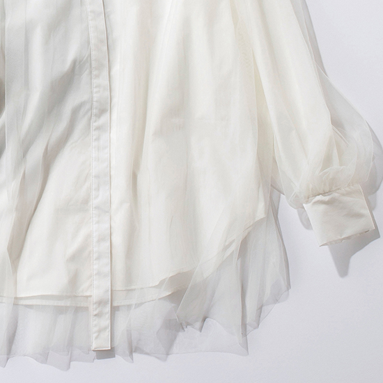 重ねたチュールは生地をふんだんに使いながらもドロップショルダーや落ち感で