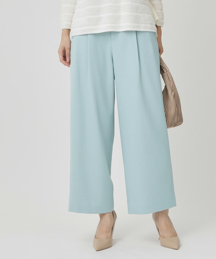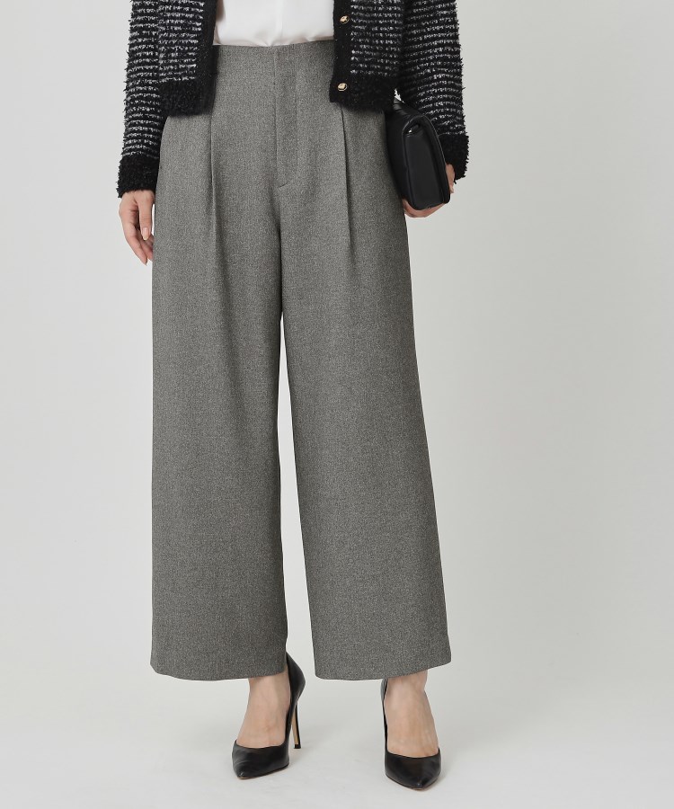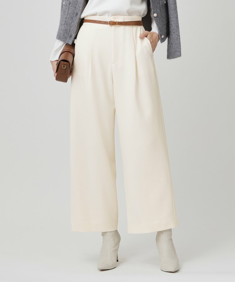 〇デザインポイントポリエステル100%なのにウール見えのワイドパンツ。タックを入れたデザインでゆったりとしたシルエットがポイントです。またハイウエストなので足長効果が期待できます。後ろに平ゴムを入れていますので伸縮性のあるパンツです。シワになりにくくお手入れしやすいです。〇素材ポイントソフトで軽く、スッキリとしたウール見えのツイル素材。シワになりにくくお手入れしやすいポリエステル100%。〇スタイリングポイントデイリーにもキレイ目にもコーデしやすいおすすめアイテムです。【仕様】・ポケット数:横×2・ウエスト後ろゴム・裏地あり※オフホワイト(003)はやや透け感があります。※照明の関係により、実際よりも色味が違って見える場合があります。また、パソコン・スマートフォンなどの環境により、若干製品と画像のカラーが異なる場合もございます。