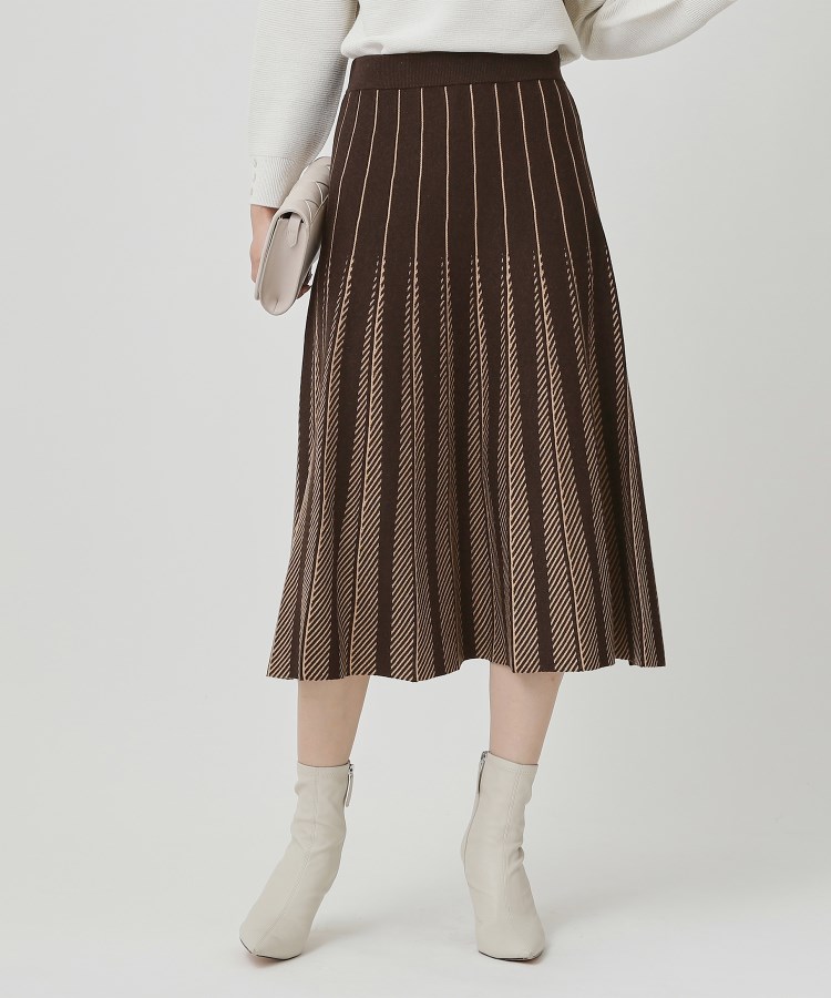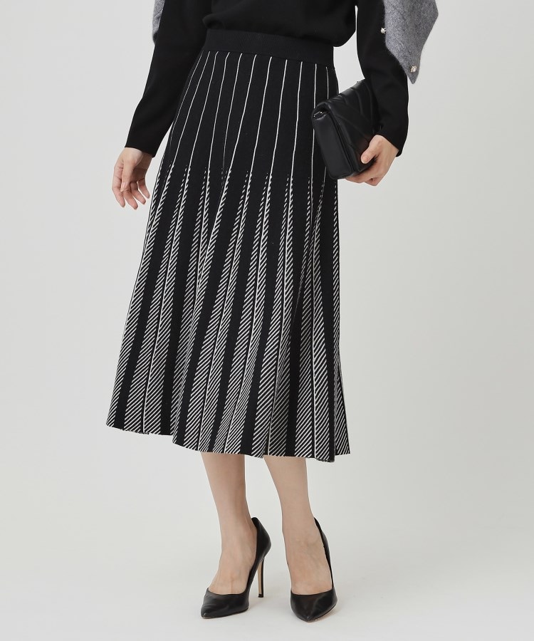 〇デザインポイントシャープな配色ラインが目を引く、印象的なニットフレアースカート。柄の縦ラインを活かしたデザインが、すっきりとした縦長効果を演出します。程よい主張のある柄ながら、全体はシンプルで合わせやすく、コーディネートの幅が広がる一枚。うっすらとプリーツのような凹凸感を編み柄で表現し、動きのある表情豊かな仕上がりに。伸びの良いニット素材で着心地は快適ながら、フレアーシルエットが美しく、きちんと感もキープ。〇素材ポイントアクリルとポリエステルにウールをブレンドした、セミそ毛風素材。ソフトでしっとりとしたタッチです。表面が僅かにふんわりとして、温かみもあります。〇スタイリングポイントお出かけやカジュアルシーンにはもちろん、ブラウスやジャケットを合わせてオフィススタイルにもオススメです。【仕様】・ポケットなし・裏地なし※こちらの商品はやや透け感があるため、インナーの着用をおすすめします。※照明の関係により、実際よりも色味が違って見える場合があります。また、パソコン・スマートフォンなどの環境により、若干製品と画像のカラーが異なる場合もございます。