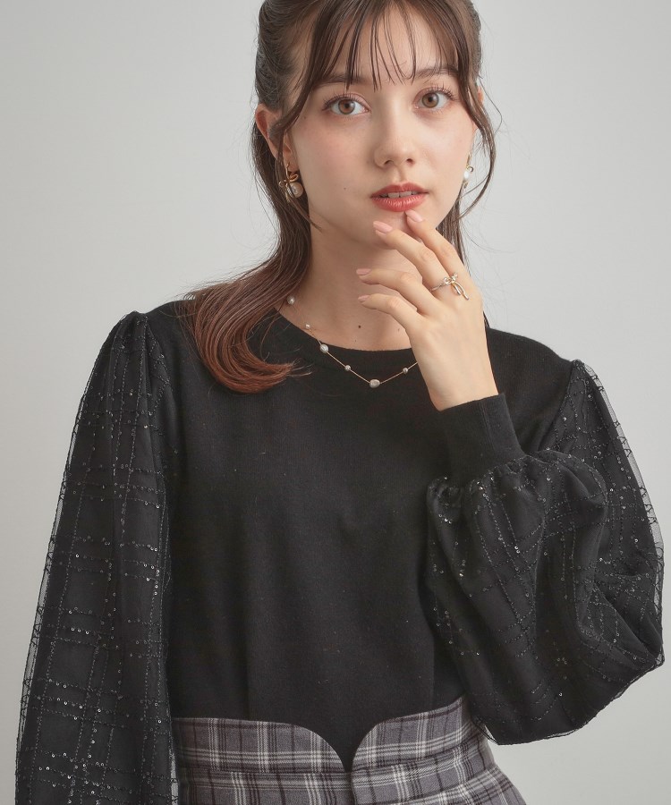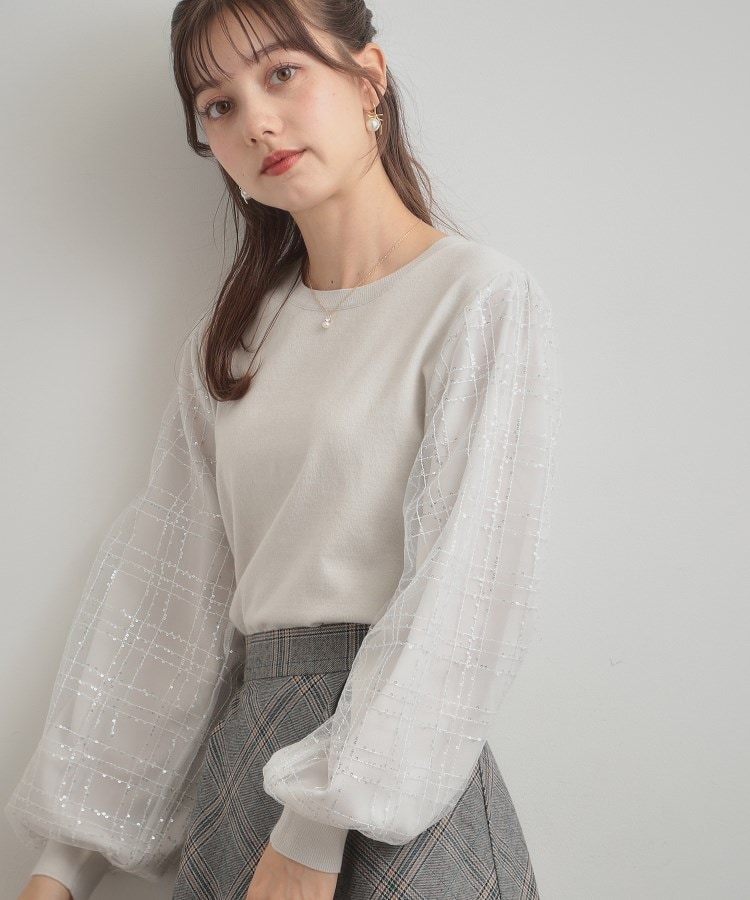 一枚で華やかに決まるデザインニットプルオーバー~POINT~涼しくなってきた時期にぴったりな素材感で、アウターもすっきり着ていただけます◎【素材】本体部分にはやわらかい天竺編みのニット、袖は上品にきらめくスパンコールチェックチュール素材に透け感の少ないジョーゼット素材を重ねたデザインに。※マシンウォッシャブル、本体部分にリサイクル素材、吸湿発熱機能付き。※照明の関係により、実際よりも色味が違って見える場合があります。また、パソコン・スマートフォンなどの環境により、若干製品と画像のカラーが異なる場合もございます。【スタッフコメント】shino(164㎝)袖のチュールデザインがコーディネートのアクセントになります!さりげなくきらりと光る素材感がお出かけコーデにぴったりです◎【25AW NEW ARRIVAL】【25AW NEW COLLECTION】
