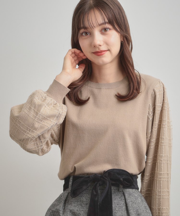 【フェミニン・着映え】袖チェックチュール ドッキングニット