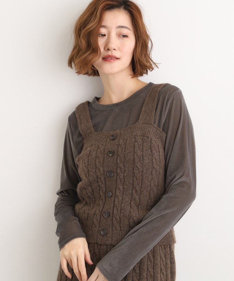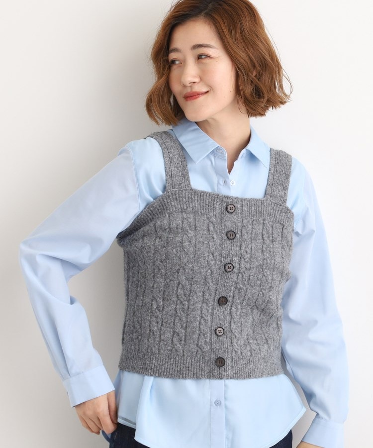 着回しを楽しむ表情豊かなレイヤードビスチェ【デザイン】立体感あるケーブル編みに、前立て風デザインと水牛調ボタンをあしらったクラシカルな表情のビスチェ。肩紐の裏側にはグログランテープを叩きつけ、さりげないアクセントと安定感をプラスしました。コンパクトなシルエットで、重ねるアイテムを引き立てます。【素材】ふわっとした温かみと軽さを兼ね備えた糸を使用。ケーブルの凹凸が際立ち、グレーやブラウンでは杢調ならではの奥行き感も楽しめます。ニットならではの伸縮性で快適な着心地です。【スタイリング】同素材のケーブルニットスカートやカーディガンとセットアップで着用すれば、存在感あるスタイリングが完成。Tシャツやシャツとのレイヤードで秋らしく、リブニットを重ねて冬らしい着こなしも楽しめます。あえてジャケットのインに着用いただくのもおすすめです。単品でもデニムやスラックス、スカートなど幅広いアイテムに合わせやすく、着こなしの幅を広げてくれるアイテムです。※着用しているインナーは本商品ではございません。※照明の関係により、実際よりも色味が違って見える場合があります。また、パソコン・スマートフォンなどの環境により、若干製品と画像のカラーが異なる場合もございます。【25AW】