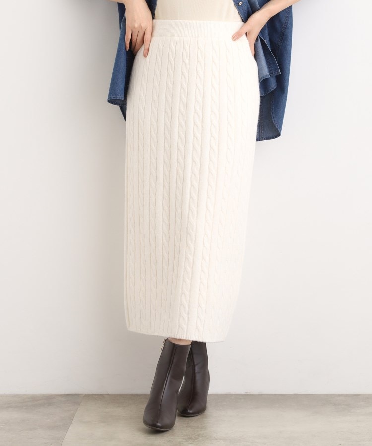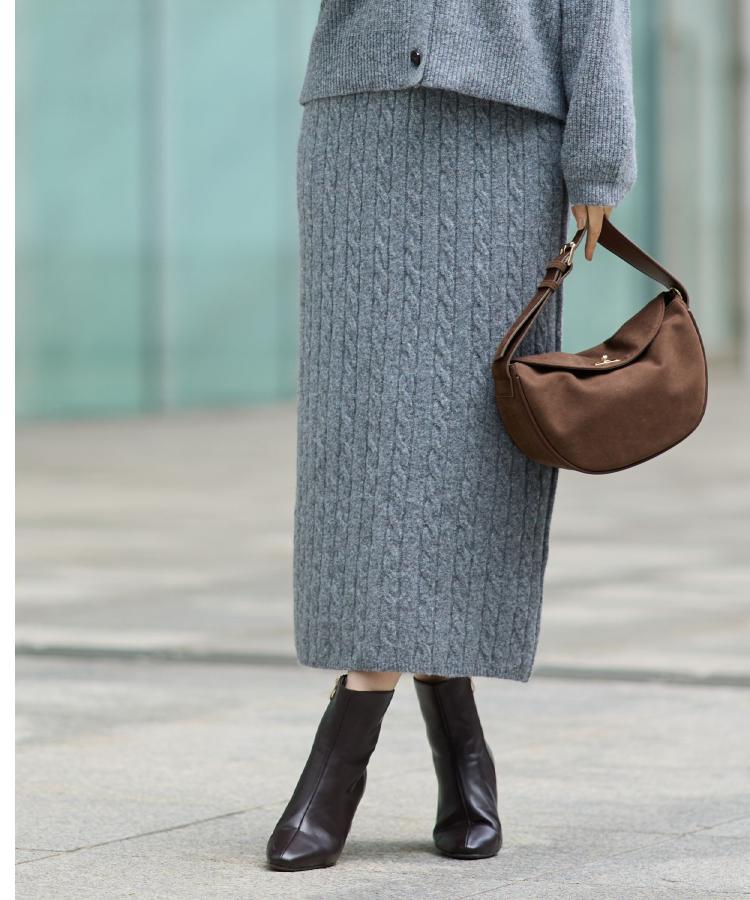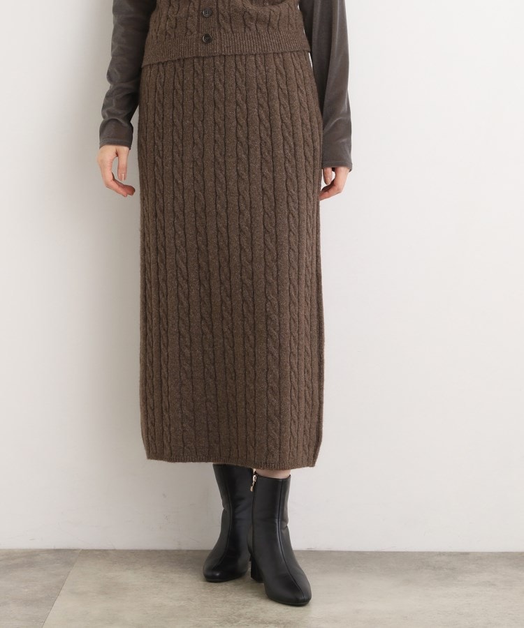 凹凸ケーブルが映える、あたたかみのある冬映えスカート【デザイン】縦ラインを強調するナローシルエットに、立体感のあるケーブル編みを施したマキシ丈ニットスカート。ニットならではの伸縮性があり、快適な穿き心地を実現。裏地にはジャージ素材を使用し、安心感と着やすさをプラスしました。【素材】ふわっとしたタッチと温かみのある糸を使用。グレーとブラウンは杢調で奥行きのあるニュアンスを表現。凹凸のあるケーブルが編地の表情を引き立て、シーズンムードを高めます。【スタイリング】同素材のケーブルキャミビスチェや畔編みカーディガンとのセットアップで着映えするスタイルが完成。単品使いでも、オーバーシャツをラフに合わせたり、スウェットでカジュアルダウンした着こなしもおすすめ。足元はブーツやパンプスできれいめに、スニーカーで抜け感を出すなど、幅広いスタイリングに対応します。【仕様】・ポケットなし・ウエスト総ゴム・裏地あり※裏地のない部分はやや透け感があります。※照明の関係により、実際よりも色味が違って見える場合があります。また、パソコン・スマートフォンなどの環境により、若干製品と画像のカラーが異なる場合もございます。【25AW】