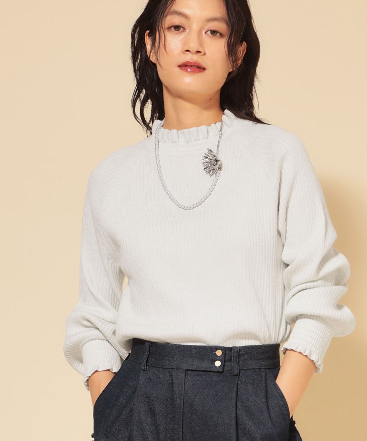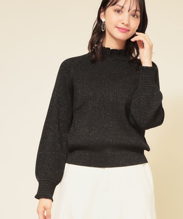 【デザイン】衿と袖口のフリル編みがフェミニンなラグランスリーブニット。衿元は上品なスタンドネックで、身頃も程よいリブなのですっきりした印象に。【素材】柔らかいセミ梳毛糸にラメ糸を撚糸することにより、上品な光沢に仕上げています。【スタイリング】着こなし易いオフ・クロ・ライトブルーの3色展開です。※照明の関係により、実際よりも色味が違って見える場合があります。また、パソコン・スマートフォンなどの環境により、若干製品と画像のカラーが異なる場合もございます。