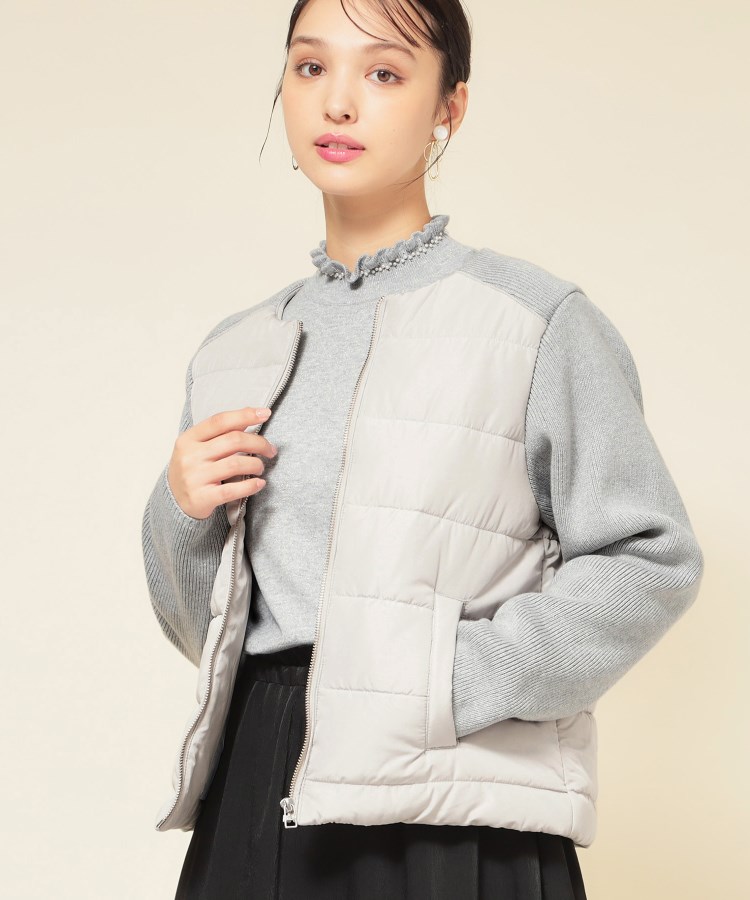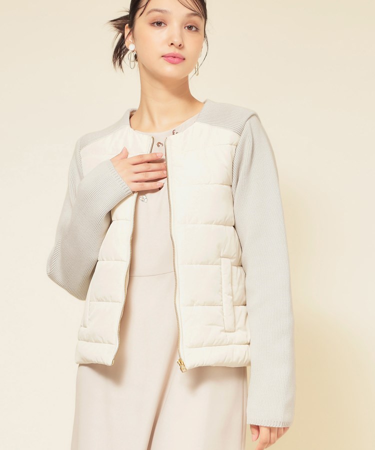 【デザイン】中綿とニットを掛け合わせて作られたニット×キルトの軽くて暖かな異素材アウター。腕回りをニットにしたことで動きやすく、日々の生活の中でも着やすくスタイリッシュなデザインになっています。【素材】ニット部分は温みのあるアクリル混素材を使用し、キルト部分は高密度のタフタにポリエステルの詰めものを使用しています。【着こなしポイント】ラフになりすぎずに着られるので普段使いに、またスカートやキレイめなパンツとのスタイリングもおすすめです。【仕様】・ポケット数:横×2・身頃のみ裏地あり■サイズ表示について※バイイング商品のため下げ札サイズ表記とワールドサイズ表記が異なります。製品寸法をご確認くださいませ。ワールドサイズコード38=製品サイズ表記F※照明の関係により、実際よりも色味が違って見える場合があります。また、パソコン・スマートフォンなどの環境により、若干製品と画像のカラーが異なる場合もございます。