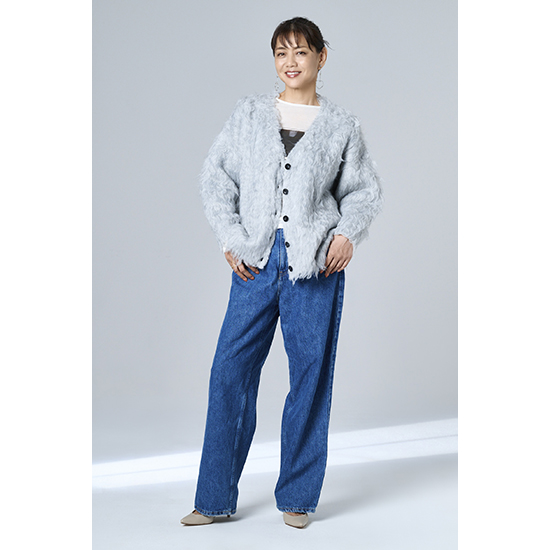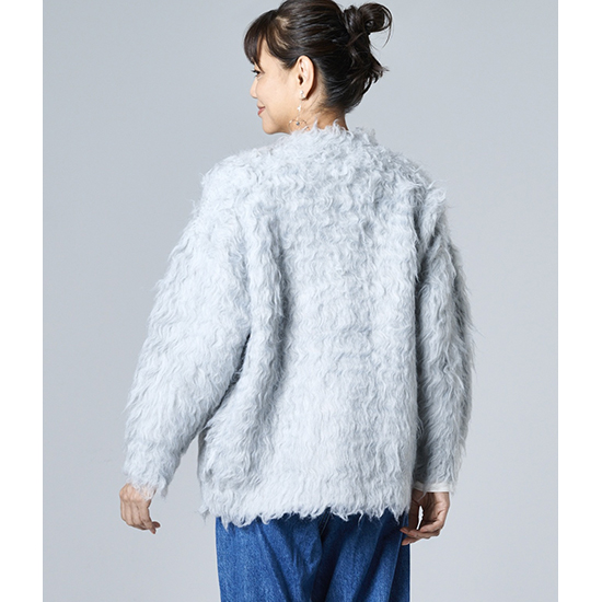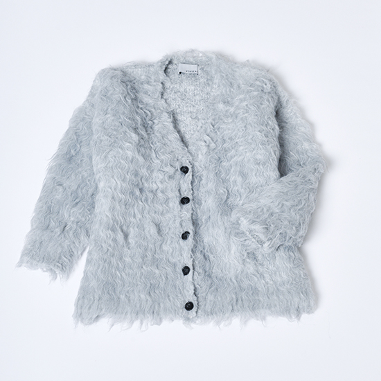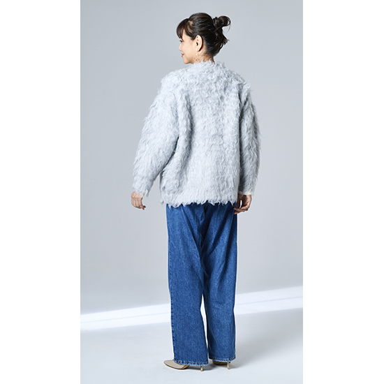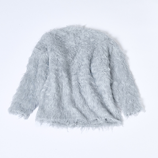 毛足の長い犬の柔らかな被毛をイメージした、ファジーニット。波打つようにランダムに流れる編地が、動きと立体感を生み出し、どの角度からも視線を惹きつけます。