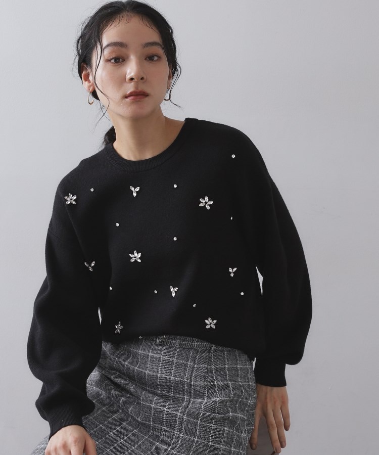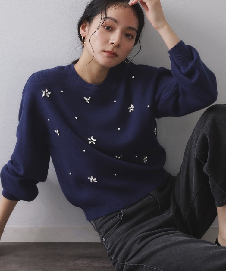 ランダムに配置したビジューが華やかなニットトップス【デザイン】・ニットトップスの前身頃に、ビジューをあしらった華やかなトップス。・3種類の形のビジューをランダムにあしらい、甘すぎず大人な印象の一枚に仕上げています。・身頃はベーシックなクルーネックニットで、ボトムスを選ばず合わせられるニットトップスです。【素材】・ハイゲージの合繊糸を使用しており、程よい厚みできれいめに着用できる素材感です。・ハンドウォッシャブルでご家庭でお手入れ可能です。※照明の関係により、実際よりも色味が違って見える場合があります。また、パソコン・スマートフォンなどの環境により、若干製品と画像のカラーが異なる場合もございます。