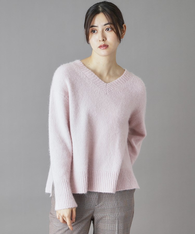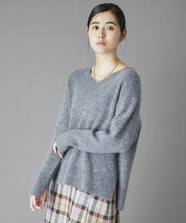 【素材の表情が魅力の抜け感ニット】●昨年の店舗限定デザインが好評に伴い、素材を新たに再登場●Vネックの衿元が女性らしい抜け感を演出●アルパカ混の長い毛足で温かみのある表情●こだわりシンプルなスタイリングでニュアンスの出るサイズ感にこだわったVネックプルオーバー。適度にゆとりを取ったシルエットは体のラインを拾いにくく、Vネックの衿元が女性らしい抜け感を演出してくれます。両脇に入れたスリットで、レイヤードやスカートとのスタイリングもしやすいデザイン。袖口の内側に入れたスリットもさりげないデザインポイントです。トラッドな印象の太めの衿がトレンド感をプラスしています。1枚でさらりと着ていただくのはもちろん、シャツやシアー感のあるタートルとのレイヤードもおススメ。●素材アルパカ混の糸を起毛し、獣毛混ならではの長い毛足の表情を活かして仕上げています。アルパカ原料と、RWS認証のウール、リサイクルナイロンをブレンドしたエシカル素材。ナイロン混にすることでソフトでスポンディッシュな軽い仕上がりとなっています。ミドルゲージでふんわりと編んだムラ感と温かみのある表情が魅力。空気を孕んだ膨らみのある編地で軽さがありながら、体のラインを拾いにくい仕上がり。シンプルなアイテムだからこそ、素材感やパーツごとの厚みの調整にこだわって仕上げました。※照明の関係により、実際よりも色味が違って見える場合があります。また、パソコン・スマートフォンなどの環境により、若干製品と画像のカラーが異なる場合もございます。