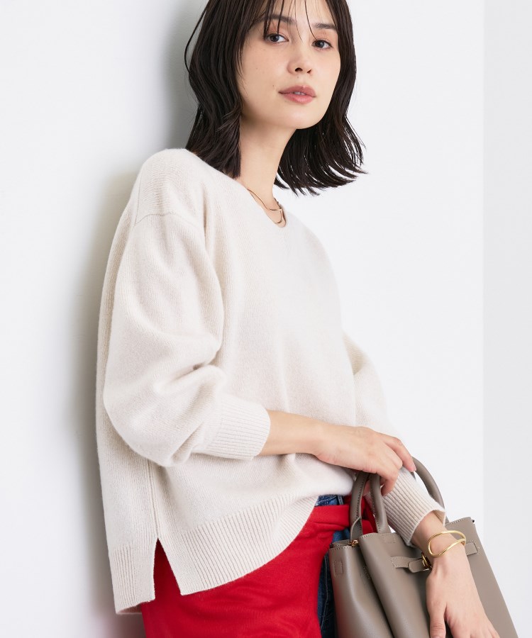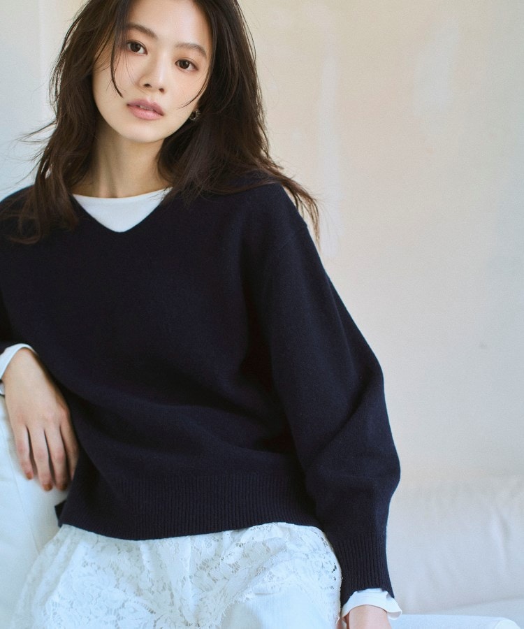 【デザインポイント】ウールにカシミヤをブレンドしたミドルゲージニット。無地と上品な微ラメの展開。浅めのVネックに女性らしい袖フォルムを加え、ほどよいパフスリーブで華やかな印象を演出します。軽めの着丈で、ボトムを選ばずバランス良く着られる一枚です。【スタイリングポイント】スカートやワイドパンツと合わせてきれいめにもカジュアルにも。インナーにカットソーをレイヤードすれば、奥行きのある着こなしが楽しめます。【素材ポイント】カシミヤと羊毛の人気素材です。オーストラリア産スーパーファインウールとモンゴル産カシミヤをブレンドした素材です。通常の紡毛糸には使用しないような非常に繊度の高い、繊維長が長い原料を使用する事で、ソフトでしっとりした風合い、カシミヤの光沢感、柔らなふくらみが良質感を表現します。※照明の関係により、実際よりも色味が違って見える場合があります。また、パソコン・スマートフォンなどの環境により、若干製品と画像のカラーが異なる場合もございます。【生地詳細】透け感:ややあり伸縮性:あり生地の厚み:普通裏地:なし洗濯方法:手洗い可