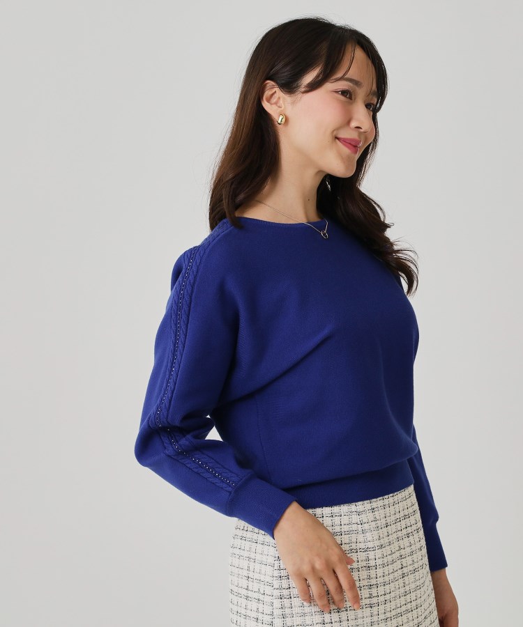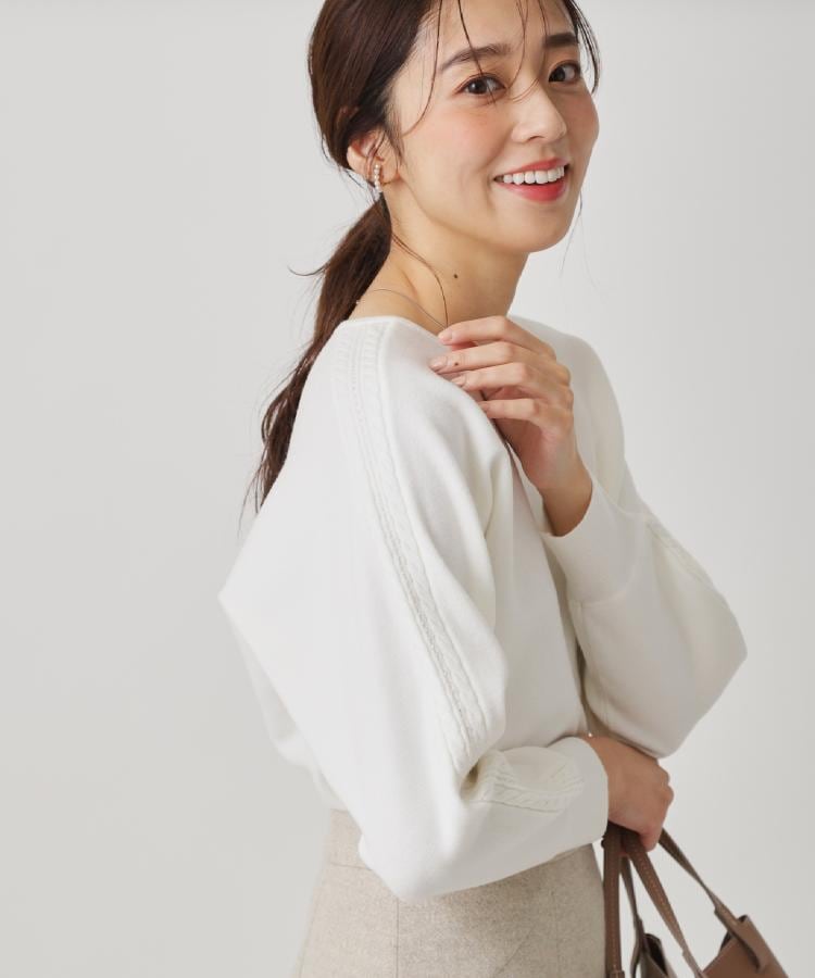 〇デザインポイント袖デザインのニットトップス。袖山のケーブル編みと繊細なビーズ手刺繍をはめ込んだクードシャンスらしいディティールがポイントです。横地使いで袖接ぎの無いドルマンのボリュームとフォルムも魅力です。スカート合わせにお薦めの1枚。ワイドパンツとの甘さを抑えたコーデも素敵です。袖口をプッシュアップしてお袖のボリュームをUPすれば抜け感が出ます。〇素材ポイント秋冬通して着て頂けるウォーミーなポリエステル混の合繊系ストレッチ素材です。ハイゲージですが総針組織でしっかりとして体の線を拾わないニット素材です。※照明の関係により、実際よりも色味が違って見える場合があります。また、パソコン・スマートフォンなどの環境により、若干製品と画像のカラーが異なる場合もございます。