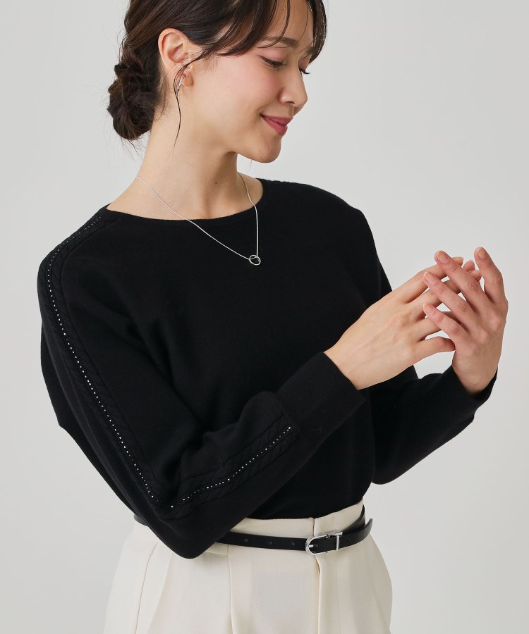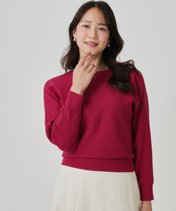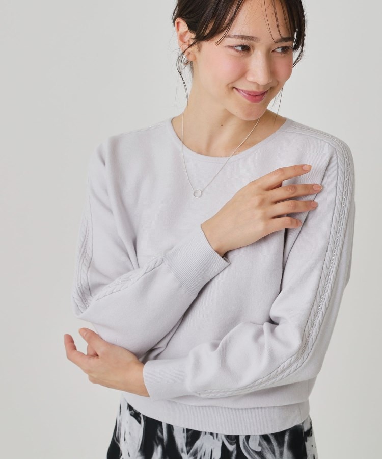 【手洗い可】ケーブルとビーズの袖デザインニットトップス