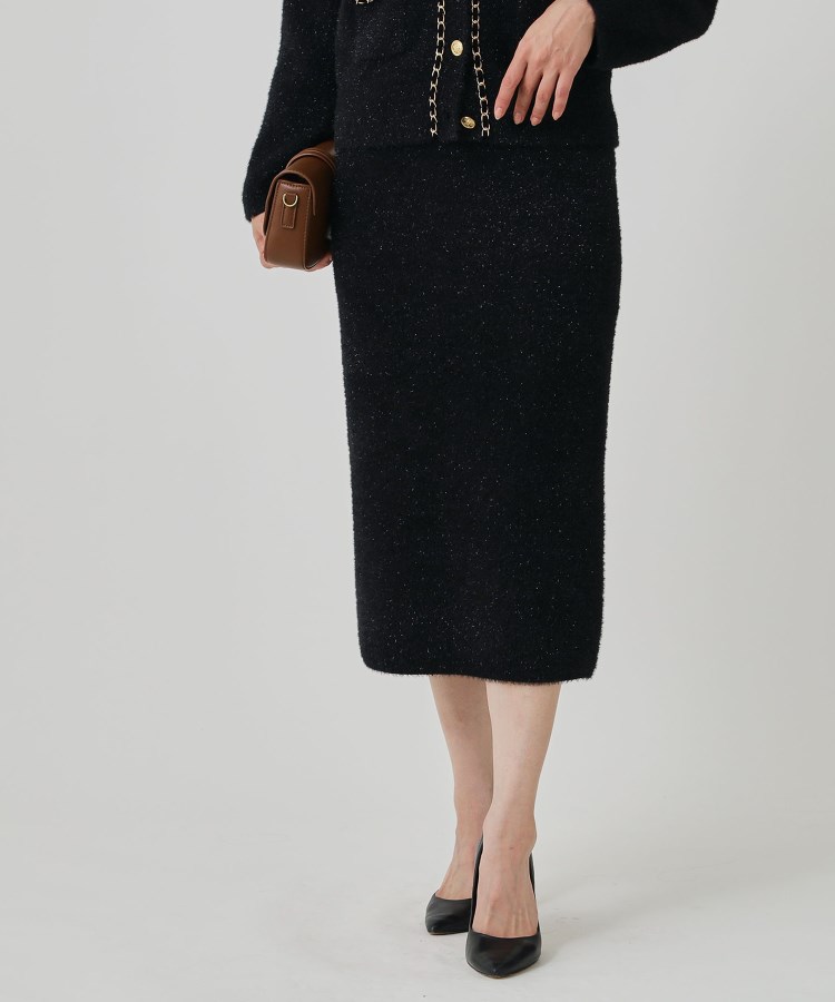 〇デザインポイントフェザーモールの華やかな表情が目を惹く、エレガントなニットスカート。接結編みによってニット特有の伸びだれを軽減し、立体的で美しいシルエットを実現しました。程よい肉厚感があり、身体のラインを拾いにくい編み地で仕上げているため、安心感のある着用感も魅力です。細身に見えながらも締め付け感が少なく快適な穿き心地。女性らしさと華やかさを兼ね備え、シーンを問わず活躍するアイテムです。同素材のカーディガン(品番187-34004)とセットアップで着用すれば、より一層エレガントで華やかな着こなしが完成。特別な日のお出かけはもちろん、日常の中で気分を上げたいときにもおすすめの一着です。〇素材ポイント表側にラメフェザーモールを使用し、裏側はポリエステルストレッチ糸による接結編みで仕立てた編み地。軽くしっかりとした風合いで伸びだれしにくいのが特長です。【仕様】・ポケットなし・ウエスト総ゴム・裏地あり※照明の関係により、実際よりも色味が違って見える場合があります。また、パソコン・スマートフォンなどの環境により、若干製品と画像のカラーが異なる場合もございます。