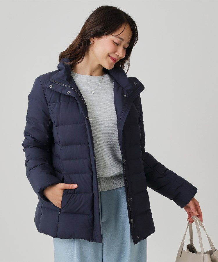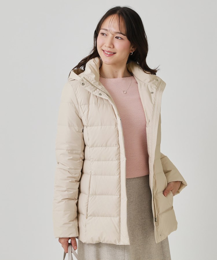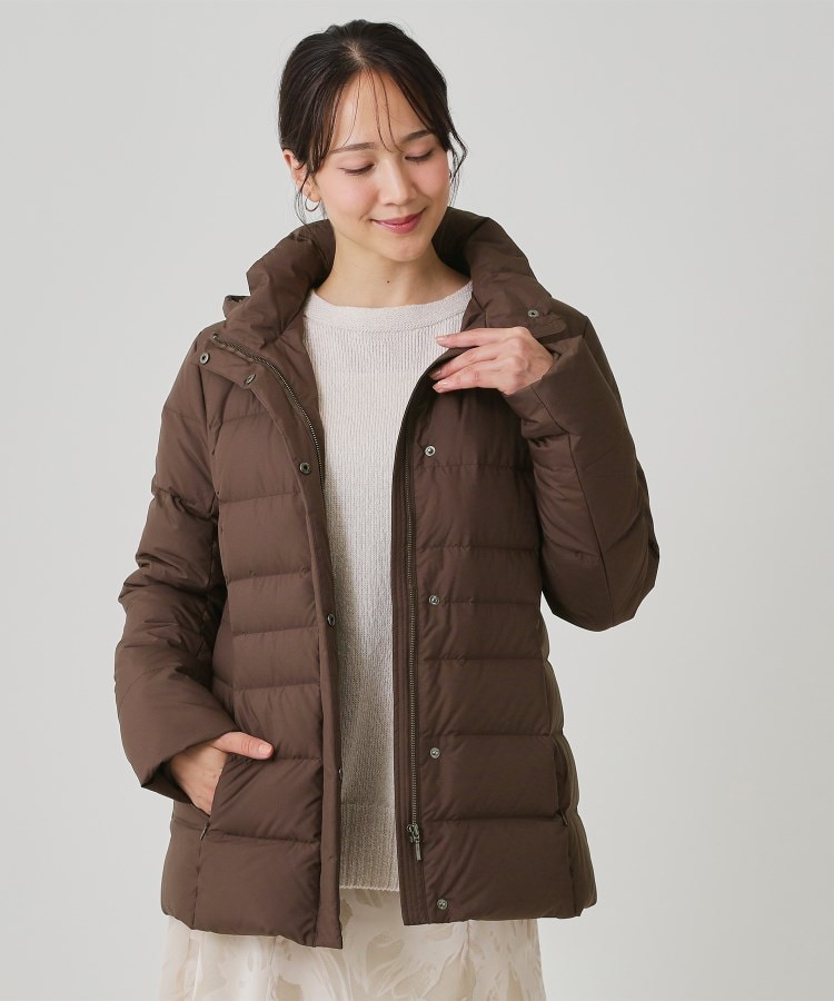 〇デザインポイントハイクオリティダウンを使用し、ウエストラインをきちんとマークしたシルエットに拘ったダウンコートです。三層構造なので軽さとしなやかさを十分に感じるダウンコートとなっています。高めのウエスト位置で横ステッチを入れ、スタイルアップ効果が期待できる工夫をしています。袖口の内側はリブをつけ、袋布にボア使用することで防寒性をアップしています。フードは取り外しが可能で、外すとスタンド衿のシャープな印象で着ていただけます。約65センチ丈でカジュアルからキレイめまで幅広いスタイルに対応できるアイテムです。ご家庭で手洗いが可能なのもポイントです。〇素材ポイントフランス産ミュラー種ホワイトダックダウンを使用したダウンコート。FP800と非常に高い保温性を有するハイクオリティダウンです。抗菌防臭加工を施し、本体の素材には環境に配慮したリサイクル素材を使用しました。※FP(フィルパワー)800・・・フィルパワーはダウンのふくらみ具合を数値化したもので数値が高いほど保温性に富んでいるとされます。700フィルパワー以上あれば高品質のダウンといわれています。【仕様】・ポケット数:横×2・裏地あり※この製品は、抗菌防臭加工をしております。この効果は永久的ではありません。※照明の関係により、実際よりも色味が違って見える場合があります。また、パソコン・スマートフォンなどの環境により、若干製品と画像のカラーが異なる場合もございます。